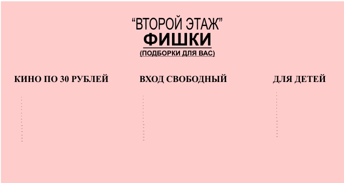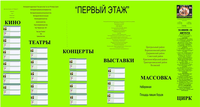 структура Вот что получилось при экспорте из корела в веб... нажеюсь, что в целом понятно, хотя и не видно многое. красным текстом - то, что является ссылкой на СТРАНИЧКУ (типичную, информационную), коричневым сцветом - то, что является ссылкой на ЛЕНТУ. На ленте летописью (постами) вся афиша, как она появляется и обновляется в городе, рядом - списки организаторов-распространителей билетов-районов, на нулевом ээтаже еще все схемы залов с местами и каталог юрлиц с выпадающими менюшками творческих единиц второй этаж - привычные разделы. Государственное - списком из ссылок на страницы, коммеречкое - постами внизу. Второй этаж - разные выборки.