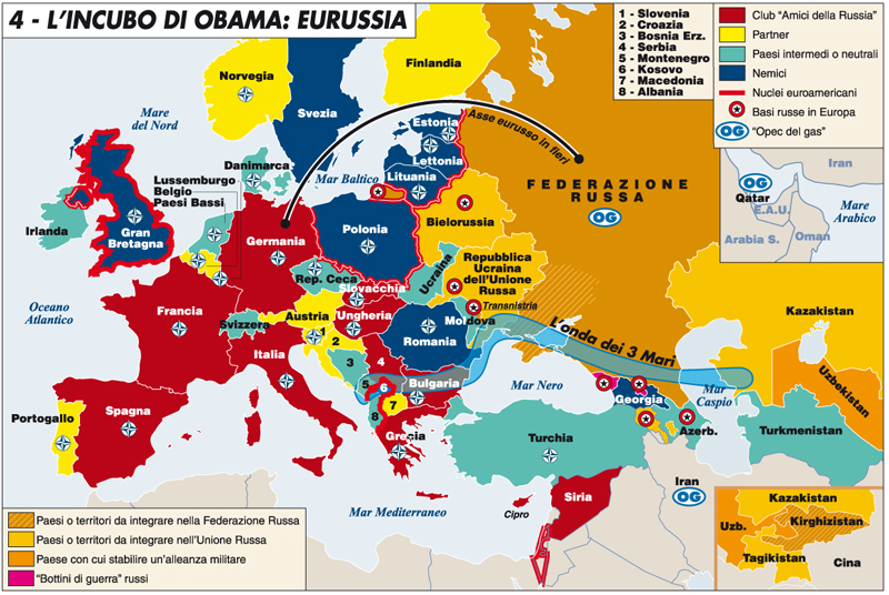 А вот как некоторым итальянским товарищам видится будущая карта Европы. Ничего там особо не потеряно, кроме ПУПСа, причем даже без буквы "У". Вот первоисточник: http://temi.repubblica.it/limes/lincubo-di-obama-eurussia/1153 Переводится (вроде как) вот так, если кто итальянским владеет - поправьте, плиз: Нижняя легенда - страны или территории, интегрированные с Русской Федерацией - Страны или территории, итегрированные в Русский Союз - страны или территории, установившие военный союз - захваченное русскими в войне Верхняя легенда: - клуб друзей России - партнёр - страны, занимающие промежуточную позицию или нейтральные - враги - евроамериканские центры - русские базы в Европе - газовое ОПЕК Я это к тому, у нас в некоторых Российских изданиях собственное место в мире принижают гораздо сильнее, чем на Западе.