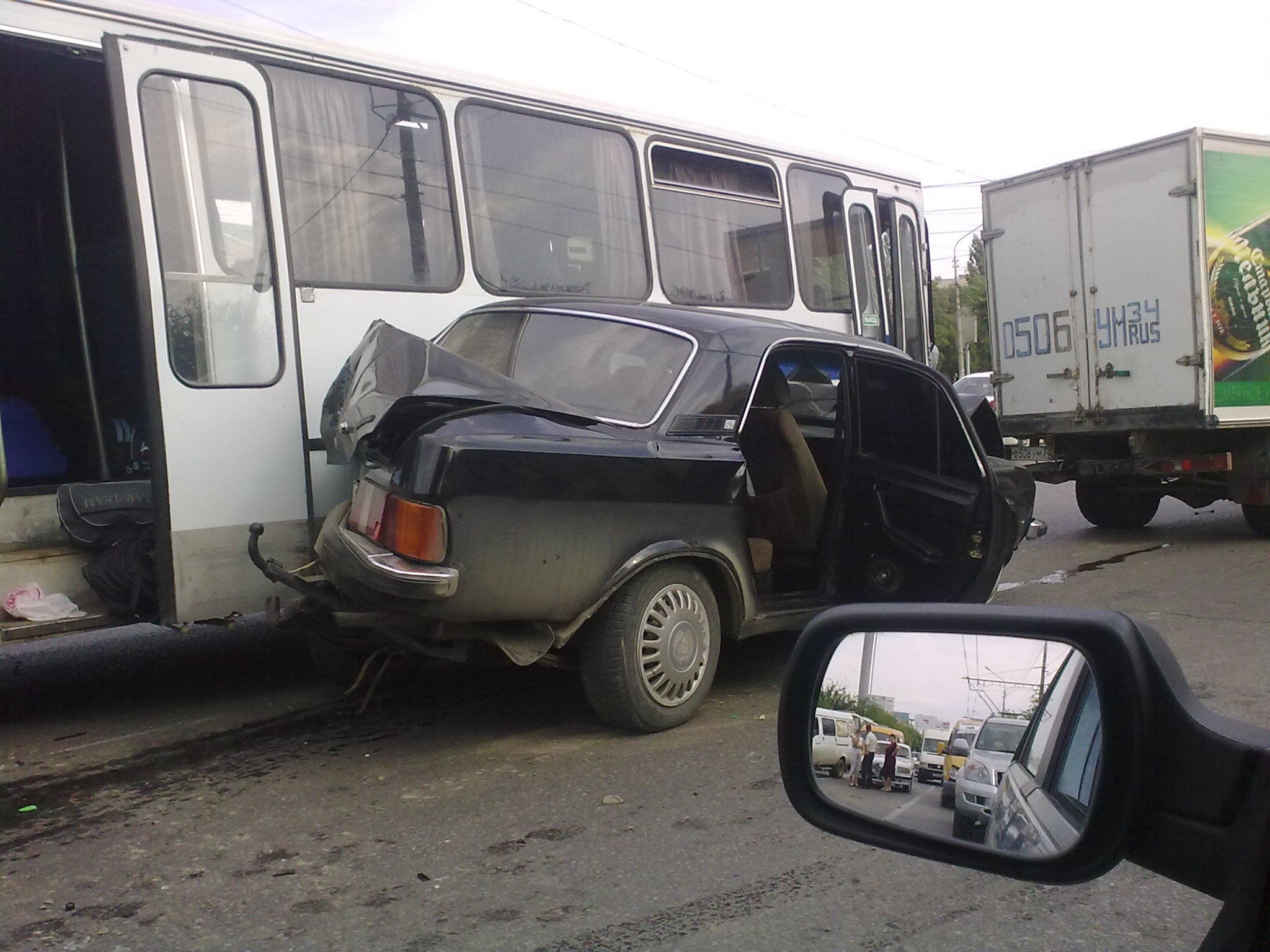 не успел сфоткать. на первый взгляд без жертв все обошлось. волга всмятку, интересно как это она так попала под автобус...
