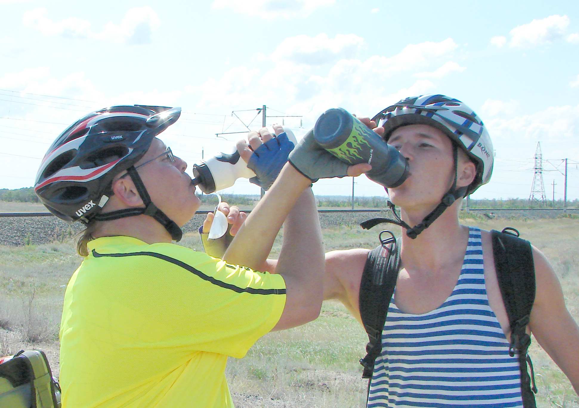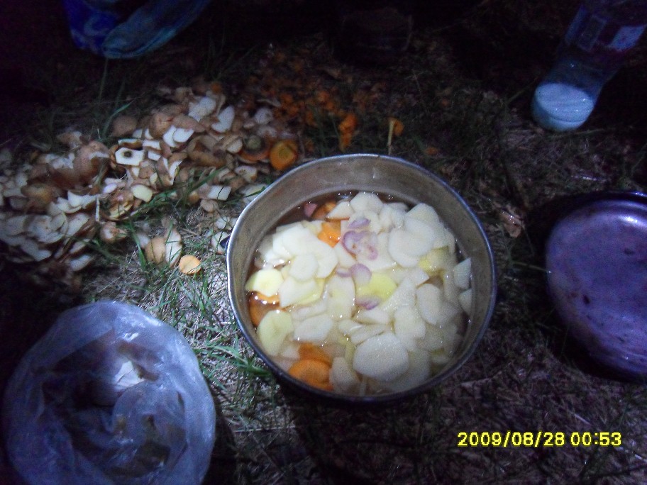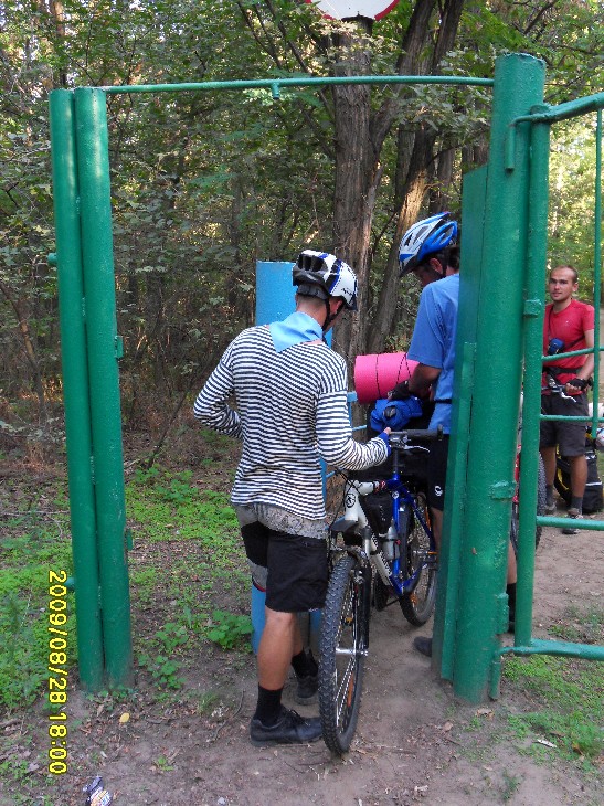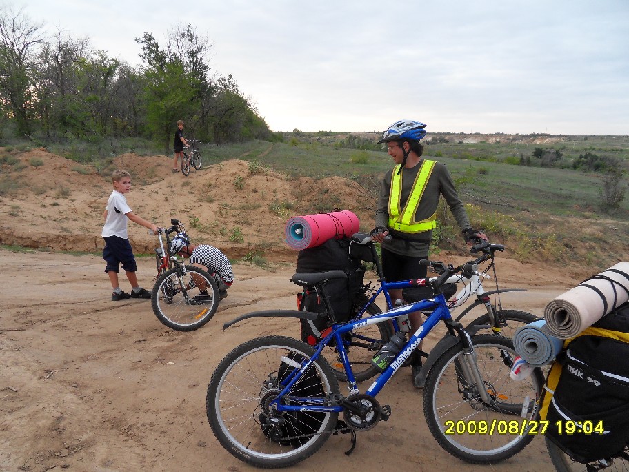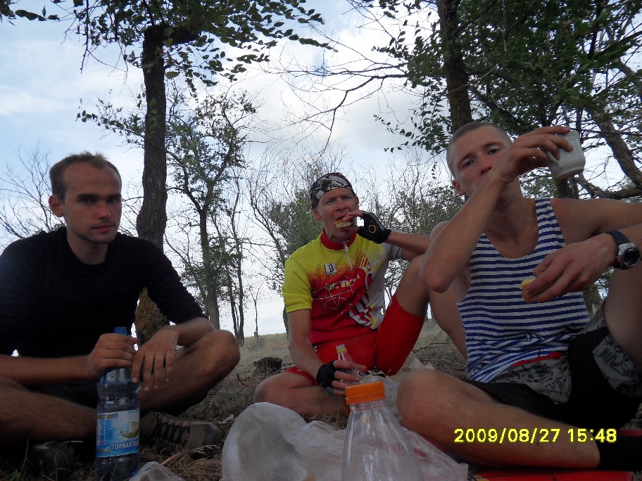 Как начиналась и развивалась покатушечная часть программы все уже примерно поняли. См: http://www.forum-volgograd.ru/showthread.php?t=137102&page=2 Начиная с 13.30 и отсоединения Blinoff`а, по одному стали отклеиваться участники, подписавшиеся только на первый день ПВД. Андрей и его добыча: В 18.30 с уходом Димок7 остались пять человек, для которых основная часть была еще впереди. Вот про ПВД я и напишу. Мои опасения, что план на день первый у нас малореален, только укрепились, когда к обеду, состоявшемуся в полдень, позади осталось меньше трети планируемого дневного пробега. Когда Димок7объяснял нам дорогу до Орловки... ... я озвучила Веронике свое видение идеального завершения дня: в Волжском мы в сумерках, на стоянке (в Средней Ахтубе) только ночью. В районе 16 часов была еще остановка на... м-м-м... полдник: На этой остановке Angel of low flight умер: Думаю, предысторию знают не все. Дело в том, что Angel of low flight, опоздавший на электричку, догонял нас своим ходом (я в это до сих пор не верю, все кажется, что это шутка). Так что у него километраж существенно выше нашего. На этом его злоключения не кончились. Начало спускать колесо. Он его все подкачивал, пока я не предложила, наконец, заменить камеру. Не настолько же мы спешим, в самом деле. И вовремя, потом, в темноте, это было бы проблематичнее. Сейчас пытаюсь вспомнить, какие были ощущения дальше, и не получается. Видимо, все было штатно. Фото помогают вспомнить детали. В 19 часов мимо нас проезжали пара мальчишек. У второго было спущено колесо, на что ему указал Angel of low flight. «Знаю» - отмахнулся мальчишка и хотел двинуть дальше, как наши решили протянуть руку помощи. dimazik накачивал колесо, пока я комментировала в таком вот духе: «Цепь там смазать не забудьте! А может втулки переберем, а?». К 20 часам были на Спартановке. Здесь мы набрали воды в кучу заранее запасенных емкостей, большинство из которых потом везли Порто 32 и Angel of low flight. У dimazik`а был только заплечный рюкзак, но и туда чего-то напихали. Потом закупились провизией на ужин в магазине. К вечеру ветер стих, ехалось на удивление комфортно. Мышцы в полном порядке, коленки, начавшие бастовать еще к обеду, протест сняли – спорт лечит! Вылезла главная проблема больших расстояний – скучно. Порто 32 упорно игнорировал остановки Ничего, когда-нибудь мы его научим различать марафоны и покатушки Никто почему-то не возмущался. Вот терпеливый народ попался! И все-таки иногда Порто 32 приходилось остановиться, чтобы посоветоваться насчет чего-нибудь, и этот шанс мы не упускали - тут же доставали заначки из карманов и сумок. Как-то спросили dimazik`а, не устал ли он, а то он с нами в покатушке первый раз. «Я устал еще 40 километров назад» - буднично ответил он. Да, усталость – странная штука. И как мы ездили без второго, третьего дыхания? Уже полная темнота: вот ГЭС и Волга, вот они уже позади, знакомый маршрут через Волжский (одна ни за что не найду), вот мы на пустынной трассе, на остановках уже прохладно. Трасса тянется, тянется… Еду и думаю, что бы я хотела сейчас съесть. Потом думаю, что мы будем есть на стоянке. О чем ни подумаю – все такое вкусное!! Кончилась – сверток на какую-то менее значимую дорогу с кучей трещин. Они уже чувствительны. Тыдын-тыдын… Кончилась – пошел грунт. В одном месте в колее вода, но не влезли. И-и-и… стоп. Приехали. ПРИЕХАЛИ!!! Мы на берегу Ахтубы, проехав за день с рюкзаками 130 км! Вот это мы-ы! Посиделки