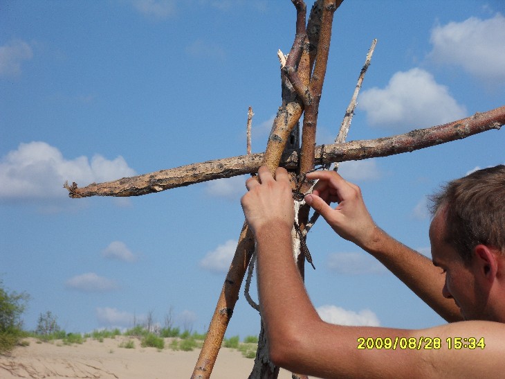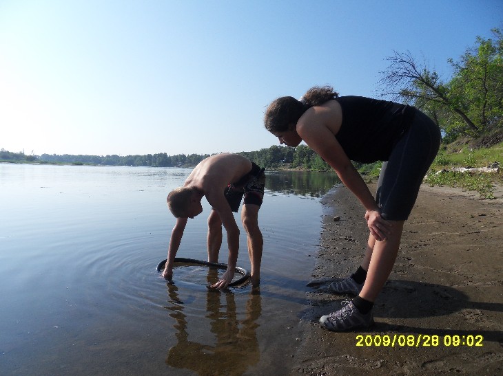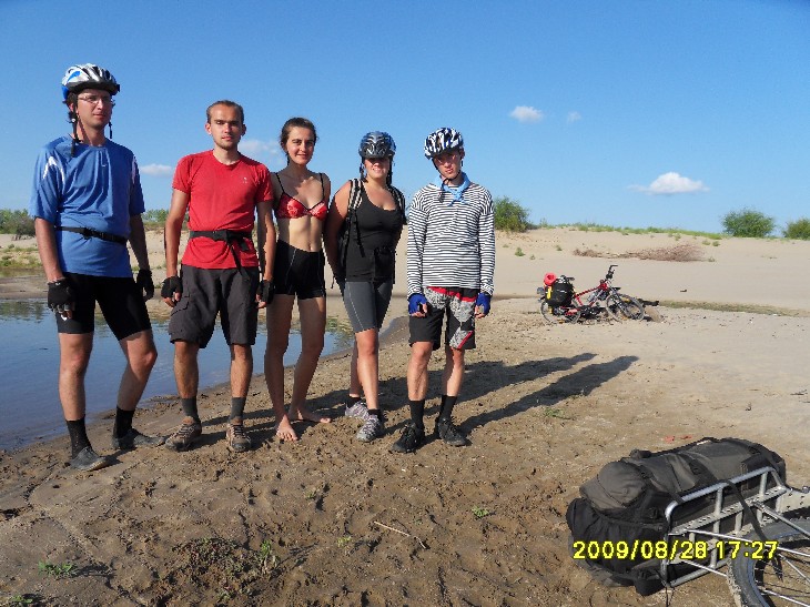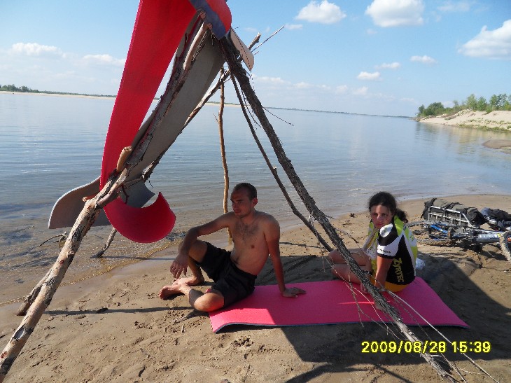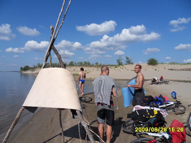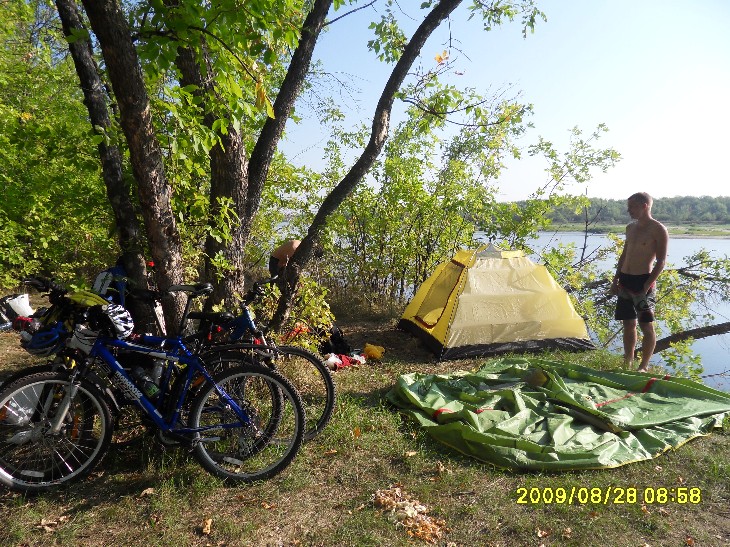 День второй Ночи стали прохладнее… Однако, не настолько, насколько я ожидала. Брала на ночь даже шерстяные носки – не надевала никакие. Вставать мы собирались часов в 8. У меня так и получилось: к 8 часам утра в палатке стало душно, ведь теперь мы входы плотно закрыли (а не как в июле – одна сеточка и без тента). Слышала, как снаружи dimazik предлагает купаться. Но посомневалась, что захочется, ведь в палатке – это одно, а снаружи может быть очень даже прохладно. Вылезла – а там такой день! Солнце светит вовсю, хотя утро пятницы прогнозировалось пасмурным. Купаться! dimazik уже искупался, но удалось его сагитировать переплыть Ахтубу. Как мне нравится, когда люди поддаются на уговоры! И как раздражает, когда долго ломаются, а потом все-таки отказываются! Ну нет, так нет, чего ломаться зря? Заходить в воду было холодно, но плыть еще вполне комфортно. Ближе к тому берегу стали появляться мели. Мокрый песок с утра еще холодный, не погреешься, и мы поплыли обратно. Быстро плавает dimazik, мне аж дыхания стало не хватать. Последней встала Вероника. Тоже предложила поплавать, но я еще не согрелась. Скоро был готов завтрак – рисовая каша со сгущенкой, чай. Потом я еще раз успела окунуться. В воде нашли вчерашние дырки: Вроде мы просто так не рассиживались, а выехали со стоянки аж в 11.30! И это при том, что Порто 32 заявил, что нам сегодня предстоит покрыть еще 130 км! 60-80 км, указанные в плане на сегодня, это в одну сторону, до конца маршрута. А еще ехать назад к пристани в Краснослободске! Куда надо еще успеть к последнему парому! С утра дорога назад до трассы показалась куда короче. Было решено изменить план, и до конечной точки проехать по асфальту, а назад – грунтами. Вероника, самая опытная велотуристка из всех нас, изъездившая пойму вдоль и поперек, знает здесь чуть ли не каждую тропинку. Ветра практически не было, тепло, но не слишком жарко (особенно в сравнении с июльским походом). Погода как на заказ! Вчера к вечеру мы ехали с Angel of low flight позади, пока остальная троица без устали гнала вперед. Теперь я ехала в авангарде. У Вероники забились мышцы ног, у Angel of low flight памперс перестал справляться со своей высокой миссией (а моему большой респект, я впервые ехала в велотрусах с памперсом, и что-то подсказывает, что они сильно повлияли на мое впечатление о дне втором), а простых шортов Angel of low flight с собой не взял. Но пройти запланированный маршрут очень хотелось. Останавливались в магазинчиках купить воды и перекусы. В 13.30 такая остановка плавно перетекла в обед под сенью придорожного дерева. В третьем часу дня мы вновь оказались на грунтовой дороге. Вышли на зеленое поле, покрытое желтыми цветами. Ехать перестало получаться, катили велики рядом, зато больше времени полюбоваться природой. Потом пошел песок, и к трем часам мы вышли на берег Волги. И тут оказалось, что всё. Финиш. Вот эти 40 км и есть весь сегодняшний отрезок маршрута! Значит, обед и купаться!!! Повели велики по берегу с целью устроить привал среди деревьев. Чапали-чапали, а место оказалось занято. Вернулись назад. Порто 32 предложил построить защиту от солнца, которую я окрестила фигвамом. Angel of low flight и dimazik деятельно включились в постройку. Фигвам-1 (опытный образец): Фигвам-2 (в процессе возведения): Вуаля – у нас есть тень! Теперь – купаться! Здесь нормально поплавать не удалось из-за сильного течения. Но после волочения ве
