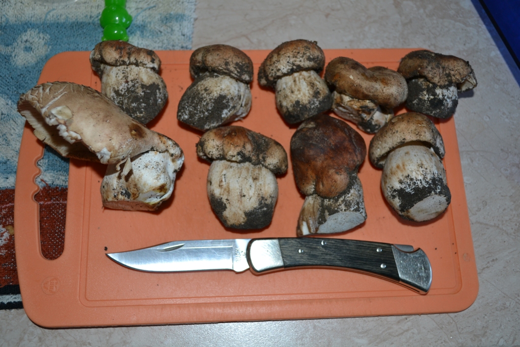 С женой сегодня катались в пойму, за 3 часа собрали почти ведро рядовок. Объём добыча так себе, зато удивило качество грибов. Такие крупные первый раз собираю, чуть меньше кулака, для сравнения общая длинна ножа 23 см.