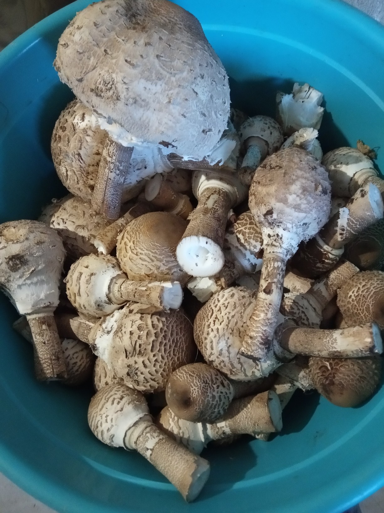 Добрый вечер. Были в пойме, нашли 8 рядовок, 9 шампиньонов, и вот кучу таких муж насрезал, говорит, их можно есть. ( Типа зонтики какие-то, но очень похожи на поганки)я думаю, нельзя. Кто-нибудь знает, что это?
