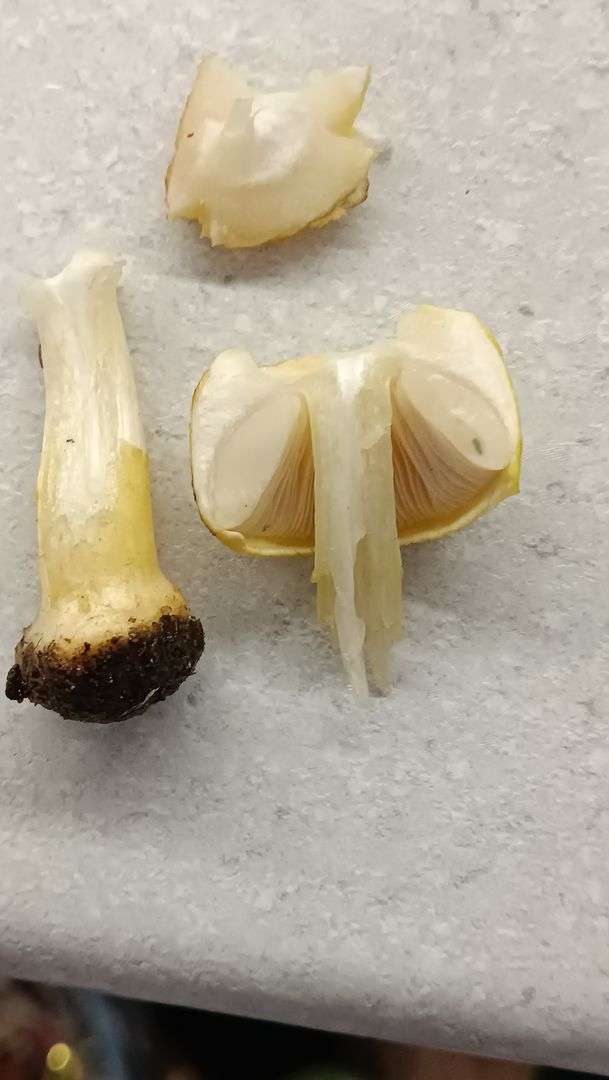 Что за гриб? Длиной 5-6 см. Был белого цвета. Полежал в воде - стал сверху желтым. Пластинки белые. Вроде, без запаха. ЗЫ: был сорван, как шампиньон. Разумеется, выкинул.