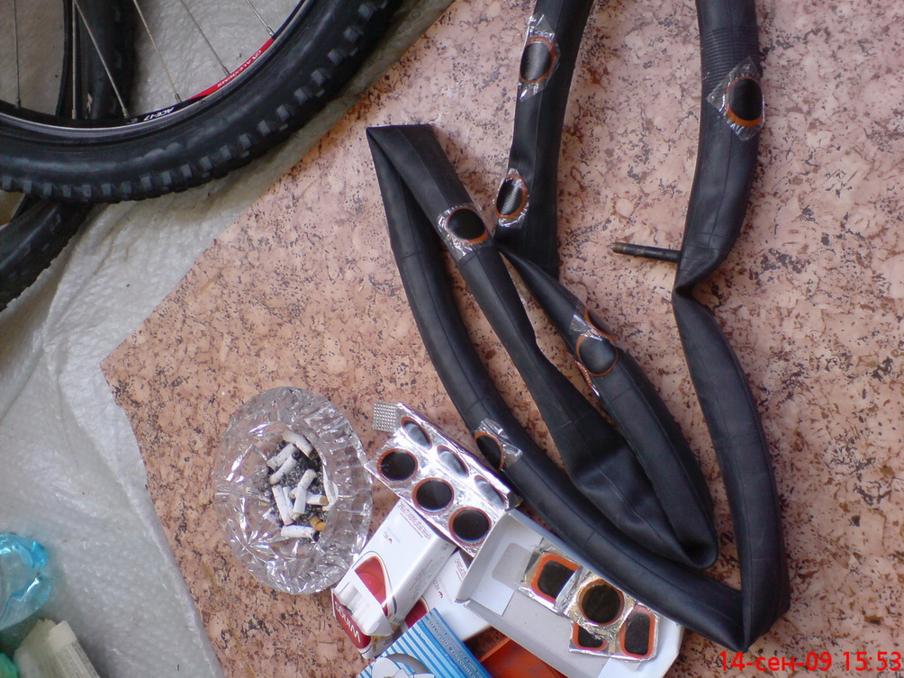 Кроме уже упоминавшихся 4 дырок, нашла я в той многострадальной камере еще 4, а еще 2 заплатки там были до этого. И нафига мне камера с 10 заплатками? Хватит, пожалуй, тренироваться, поставлю новую