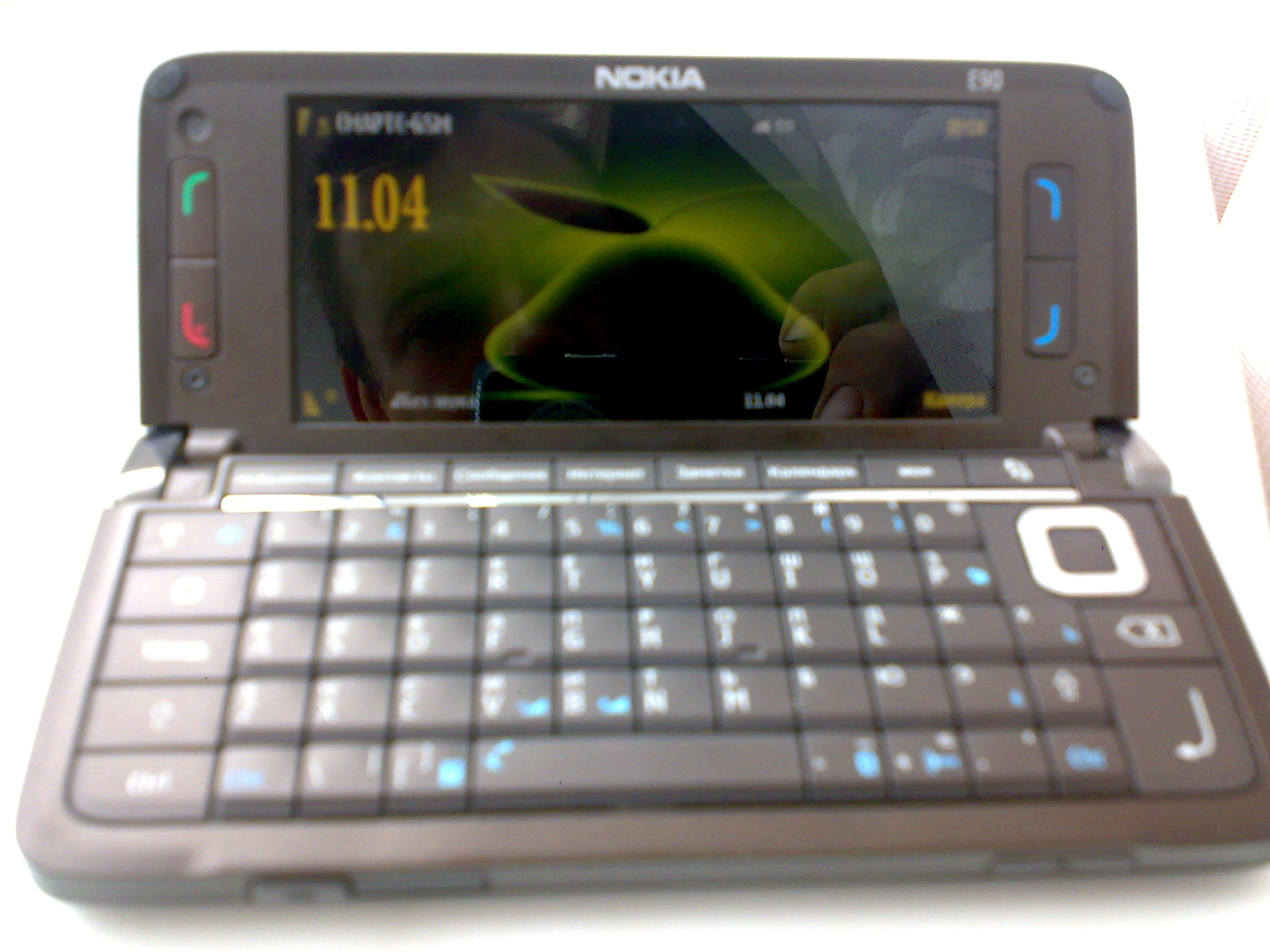 Состояние на 5 комплект полный с коробкой +флэха на 1 гиг. Наушники не использовались. имэй 353659014234757 цена 16000 торг. Возможен обмен на коммуникатор WM c WIFI. Раскладной Nokia E90 – многофункциональный коммуникатор, который является продолжателем линейки Nokia E9300 и Е9500. В раскрытом виде с широким внутренним экраном (800x352 пикселей) и полноценной клавиатурой Nokia E90 напоминает уменьшенный ноутбук. В сложенном виде Nokia E90 превращается в обычный телефон типа «моноблок» с внешним экраном (240Х320 пикселей). Характеристики Nokia E90 Общие данные Стандарт: GSM 850, GSM 900, GSM 1800, GSM 1900, UMTS (WCDMA) SAR: RA-6 - 0.65 W/kg. Смартфон: Symbian (v9.2, S60 3rd Edition, Feature Pack 1) Длина: 132 мм. Ширина: 57 мм. Толщина: 20 мм. Вес: 210 г. GPS-Навигация Аккумулятор Тип батареи: Li-ion (BP-4L) Емкомсть: 1500 mAh Время ожидания: 336 ч. Время разговора: 5 ч. Время заряда: 2 ч. Корпус Конструкция корпуса: раскладушка Материал корпуса: пластик Встроенная антенна Дисплей Технология экрана: TFT Тип экрана: 16 млн. цветов Размер экрана: 800 x 352 px Дополнительный экран: Отображает время и номер звонящего Технология доп. экрана: TFT Тип доп. экрана: 16 млн. цветов Размер доп. экрана: 240 x 320 px Работа с звуком Тип звонка: Полифонический Mp3 на звонок Стерео звонок Загружаемые мелодии Голосовой набор Голосовое управление Громкая связь Диктофон FM-радио MP3-Плеер Настраиваемые профили Телефонная книга Номера в памяти телефона Расширенная телефонная книга Поддержка групп абонентов Память Объем энергонезависимой памяти: 128 Мб Поддержка карт памяти: TransFlash (microSD) Короткие сообщения Nokia E90 MMS Предиктивный ввод: T9 Text Input ® SMS Шаблоны Передача данных Nokia E90 WAP: v 2.0 E-mail клиент HTML-браузер HSDPA EDGE GPRS: сlass 10 (4down + 2up, 5max) WiFi: 802.11g IrDA Кабель к ПК Bluetooth Стерео Bluetooth (A2DP) Push to talk Фото/Видео Встроенная камера Дополнительная камера: (QCIF) Количество пикселей: 3.2 Мп Разрешение камеры: 2048 x 1536 Встроенная вспышка Цифровой zoom: 20 X Автофокус Поддержка Видео Дополнительно Nokia E90 Органайзер Календарь Java игры и приложения: (MIDP 2.0) http://market.yandex.ru/model.xml?hid=91491&modelid=1000840&clid=502
