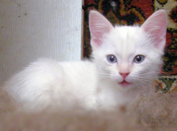 судя по фото, он не совсем белоснежный. Ушки и мордочка - рыжеватые. Красотень! А розовые уши - вообще писк! Чудесный малыш.