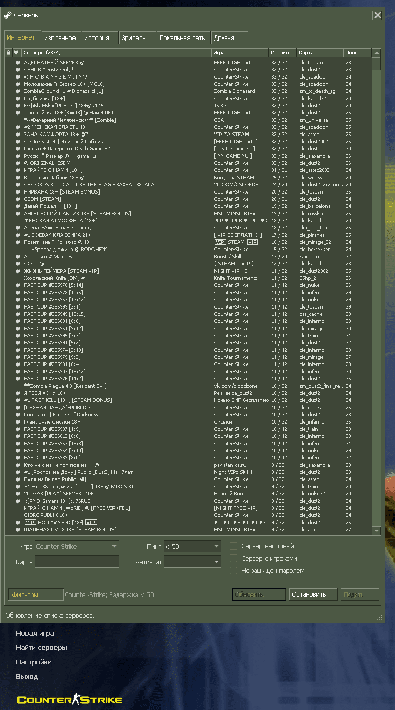 Доброго всем дня. Установил Steam, создал новую учетную запись. Установил Counter-Strike 1.6 в Steame зарегистрировал. При входе на любой сервер, зависает, курсор мыши, на кнопку "ОК" - нажать не могу. Через диспетчер задач процесс - работает. Завершаю процесс, захожу снова в CS, но теперь не видит ни один сервер, в кладке Internet. ОС Windows 7. Mail Agent - выключен, антивирус Avast - экраны все выключены до перезагрузки ПК. Никаких лишних процессов - не запущено. Как решить проблему? Ставить ХР? Или на "семерке" - поиграть не получится?