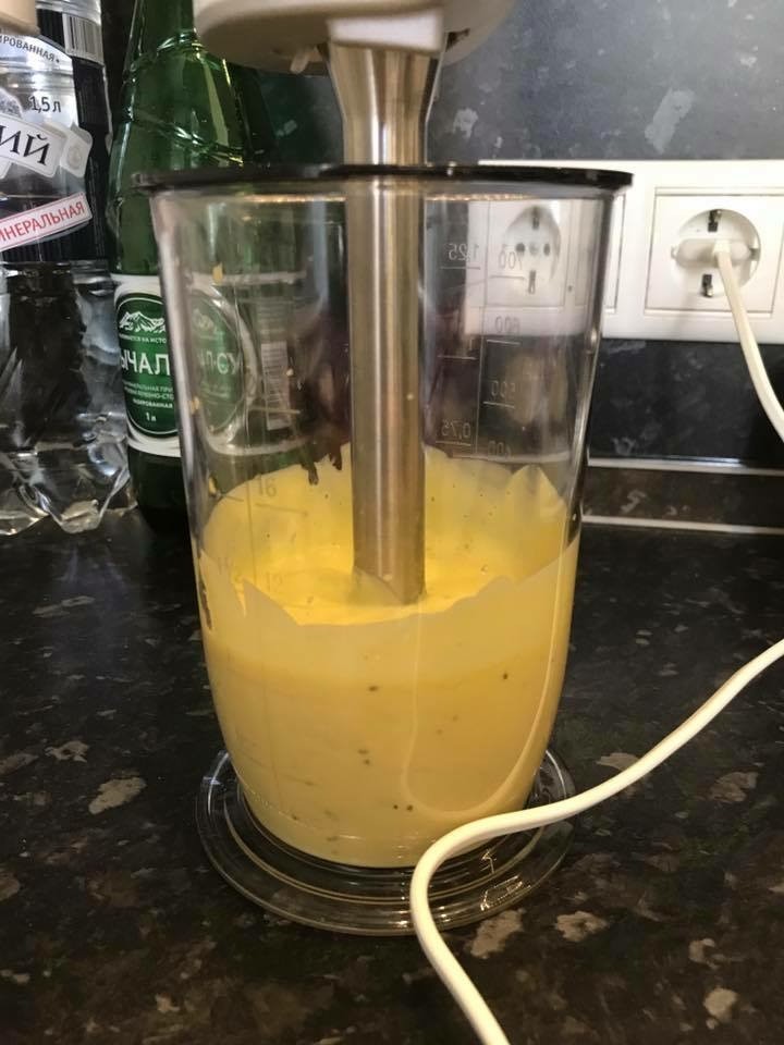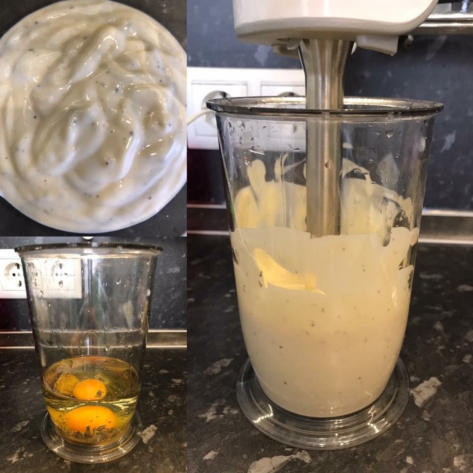 С детства знала про домашний майонез и простоту его приготовления. Вкусно получилось. Любителям майонеза, рекомендую. Масло растительное — 150 мл Яйцо куриное(свежее) — 1 шт Горчица(самая обычная, никаких дижонских и пр!) — 1 ч. л. Сахар— 1/2 ч. л. Соль— 1/4 ч. л. Сок лимонный— 1 ст. л. Специи(по вкусу), я прованские травы добавила, на втором фото с базиликом. Смешать соль, сахар, сок лимонный и специи. В ёмкость для взбивания налить масло, добавить предыдущую смесь, горчицу. Не мешаем. Добавляем яйцо. Опускаем блендер и секунд 10 взбиваем. Потом ещё секунд 10. Готово. Второе фото на домашнем яйце.