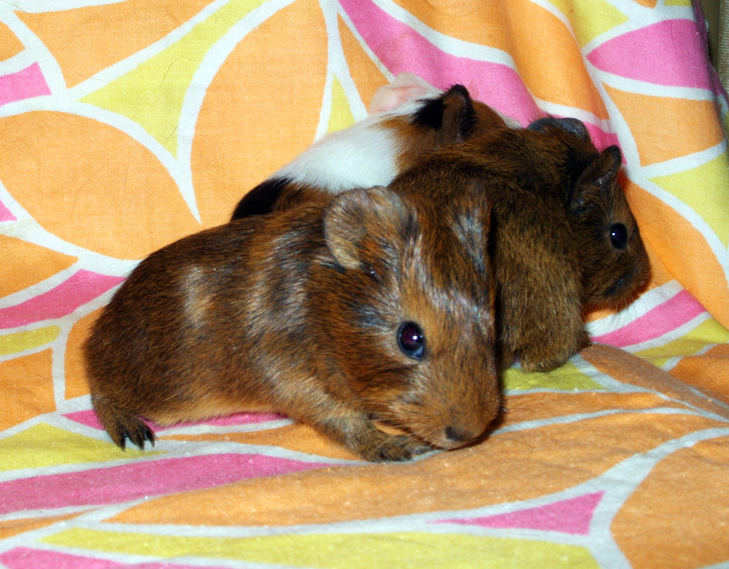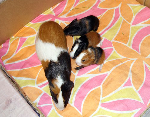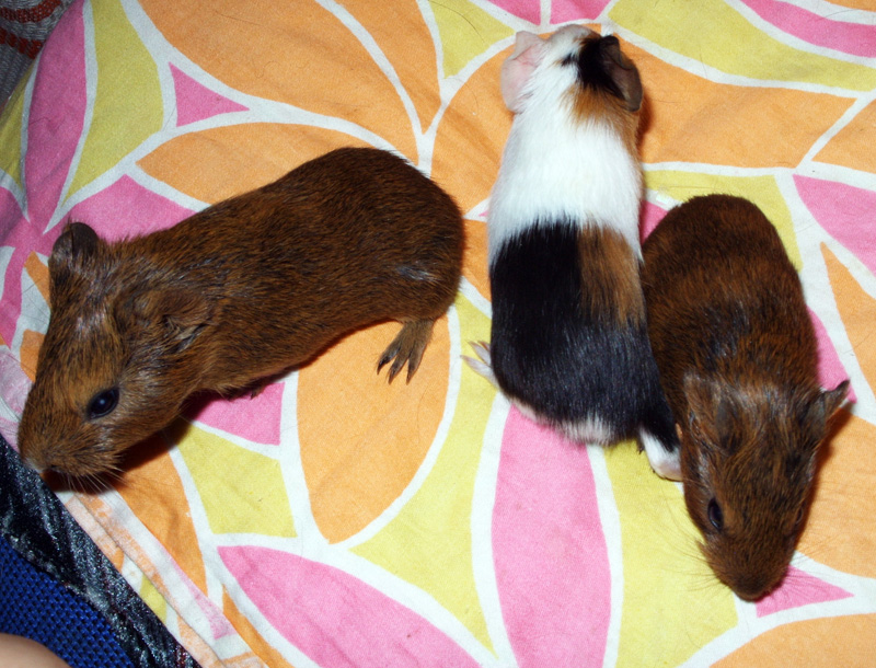 На самом деле вряд ли коты заинтересуются свинкой, как обычной мышкой. Свинки НЕ ПАХНУТ мышами, поэтому не воспринимаются ими как жертва. У крыс и хомяков сильный характерный запах, а у морсвинок вообще почти нет запаха, так природой задумано. Кроме того, свинки просто крупнее любой мыши или крысы, когда вырастают. Знаю немало случаев, когда свинки прекрасно уживались с котами, и даже играли с ними. Ну и, кроме всего прочего, постоянное место проживания для свинок все-таки - клетка. Это ведь грызуны, у них должен быть свой угол, где они могли бы точить зубы о сено, деревяшки, прутья клетки, в конце концов, но не об электропроводку по дому. Вот например мамка-свинка по сравнению с детишками из прошлого выводка: