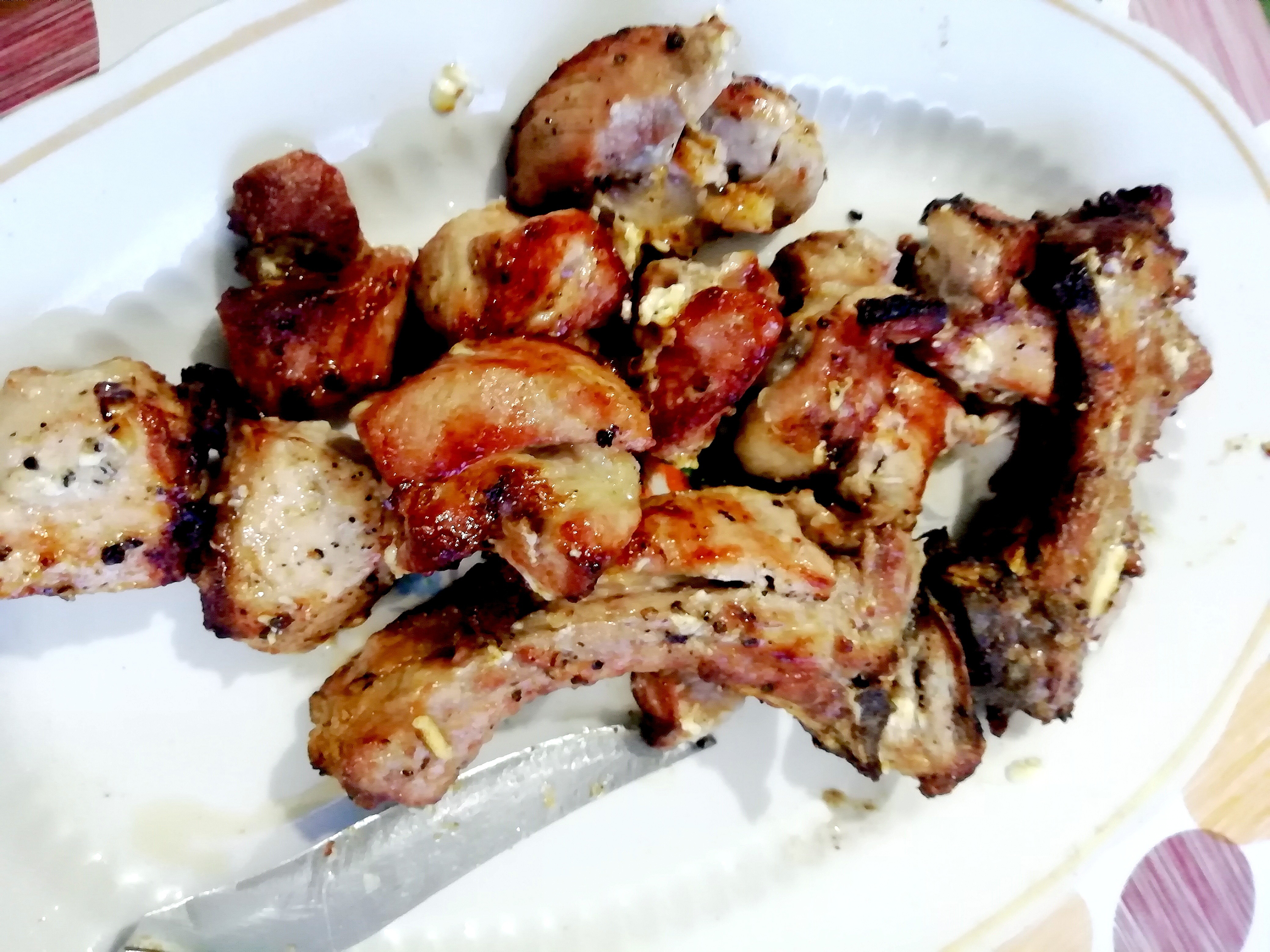 Мы помимо мяса, овощи же ещё жарим. Чаще всего, либо целиком, либо кусками. А вот шампиньоны, больше люблю когда в маринаде полежат. Сметана, соль, перец. Кабачки хорошо съедаются, кружками. И перец красный болгарский, когда прям хорошо запекается, чтобы не сырой.