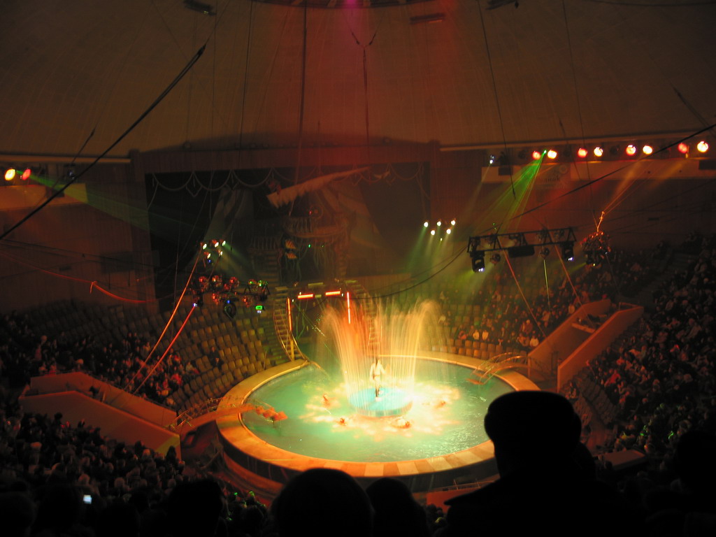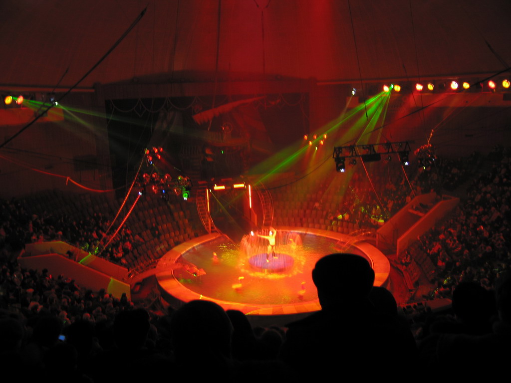Сегодня был в цирке - РЕКОМЕНДУЮ!!! Отличное лазерное шоу в течение всего представления, красивые номера на воде и под водой, клоуны приколисты!!! Ничем не воняет, в холле очень тепло, в зале на верхних рядах немного прохладно за счет включаемой во время представления вентиляции, в серединке (до 14-16 ряда) вообще нормально - видел под куполом обогреватели - дубленку снимал!!! Музон нормальный, и по качеству, и подобран толково. Светомузыка - лазеры и прожектора - просто супер!!! Животинка во втором отделении - морские котики, удавы и крокодил!!! Сегодня, 6 января, пустые только два верхних ряда и крайние сектора, первые два ряда не продавались - высокиий бортик у бассейна однако... Пришел за 20 минут до начала - купил 14 ряд, центр сектор, по 400р. Вообще цены от 400 до 700, наверно. ближе к арене и в вип-ложе по 700? Кресла старые, но не ободранные, как тут кто-то сверху выражался - обычные жесткие из кожзама аля80-е. Буфет приличный, правда коньячелло с собой принес... В общем, на 400 р отрабатывают полностью!!! Фото прилагаю...