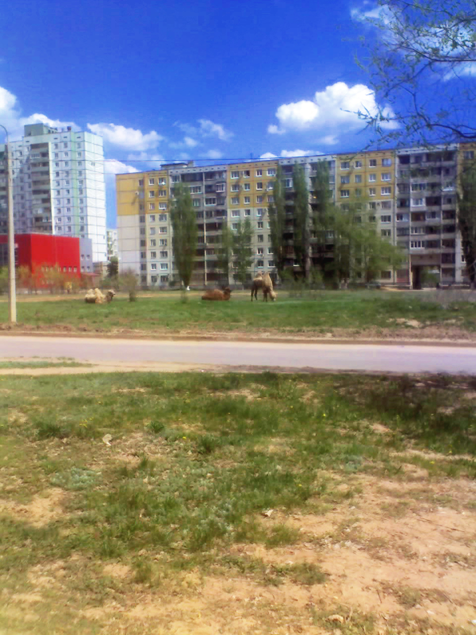 Иду я себе спокойно в магазин, сегодня. Поворачиваю голову, бац: верблюды пасутся. Спокойно так, одиноко. Как-то было неожиданно, увидеть в спальном районе города верблюдов. Не кошки всё-таки. п.с.: оказалось там цирк-шапито открыли. Если кому интересно это 7 Ветров.
