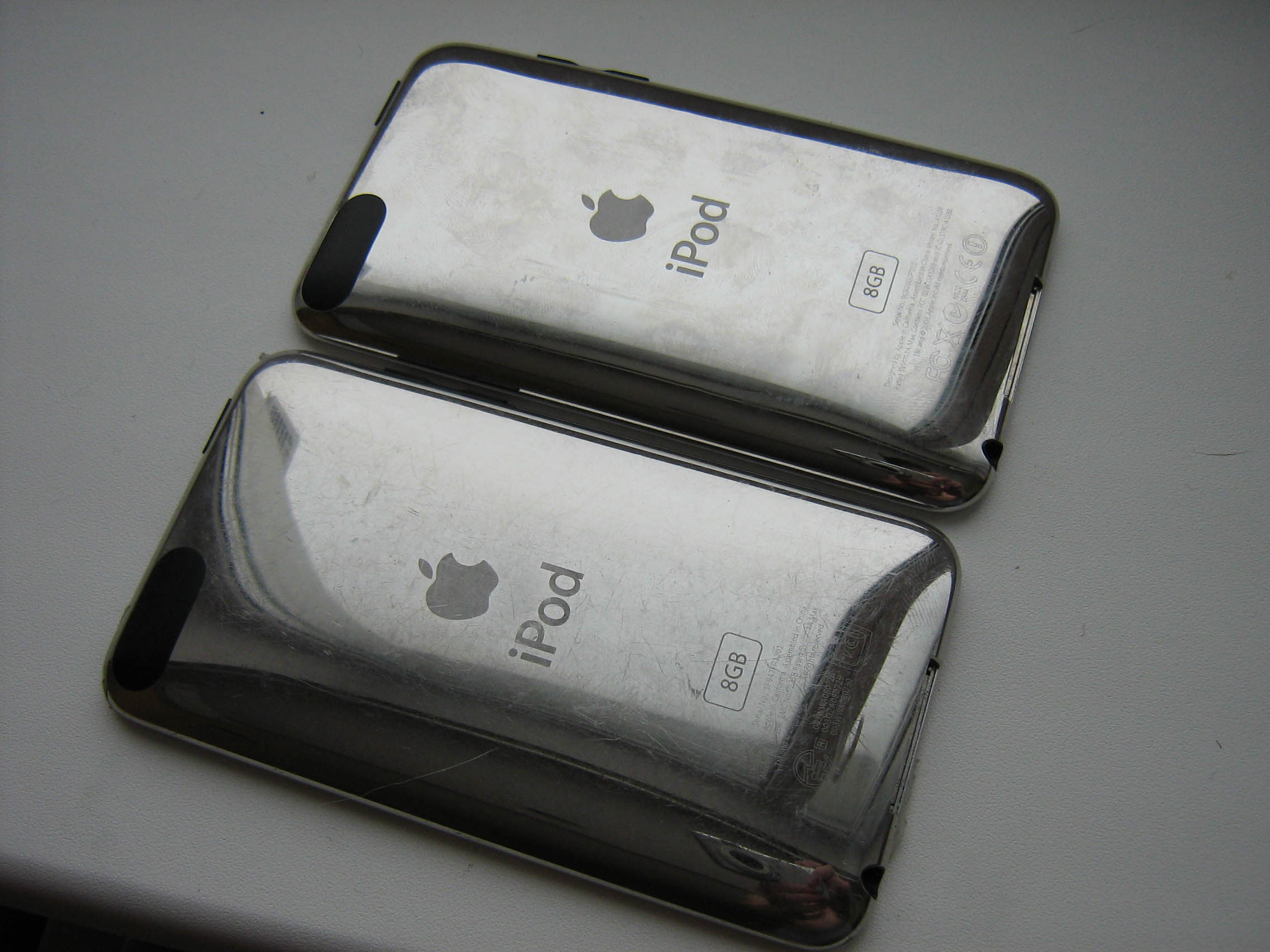 VK77, оба (Apple iPod touch II 8Gb) фото сделать нет возможности. 1ый в идеале 2ой буквально одна заметная царапушка на стекле 2мм