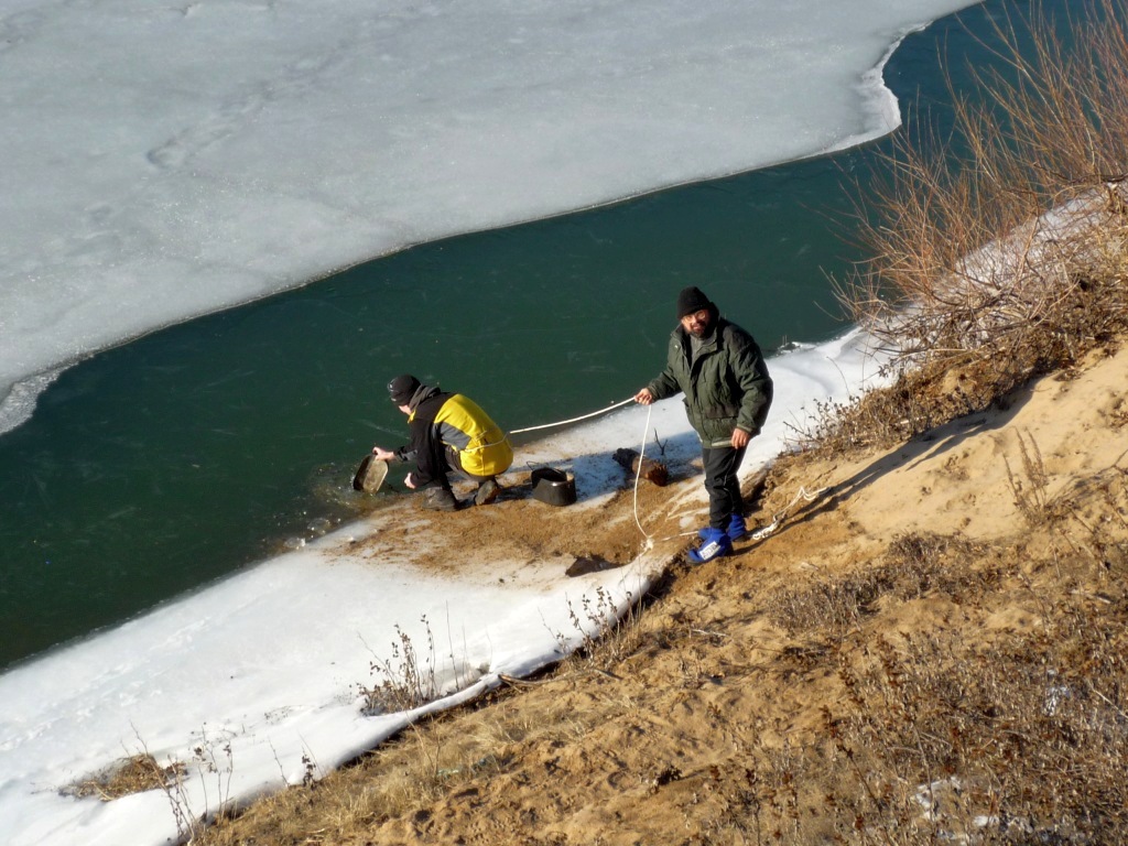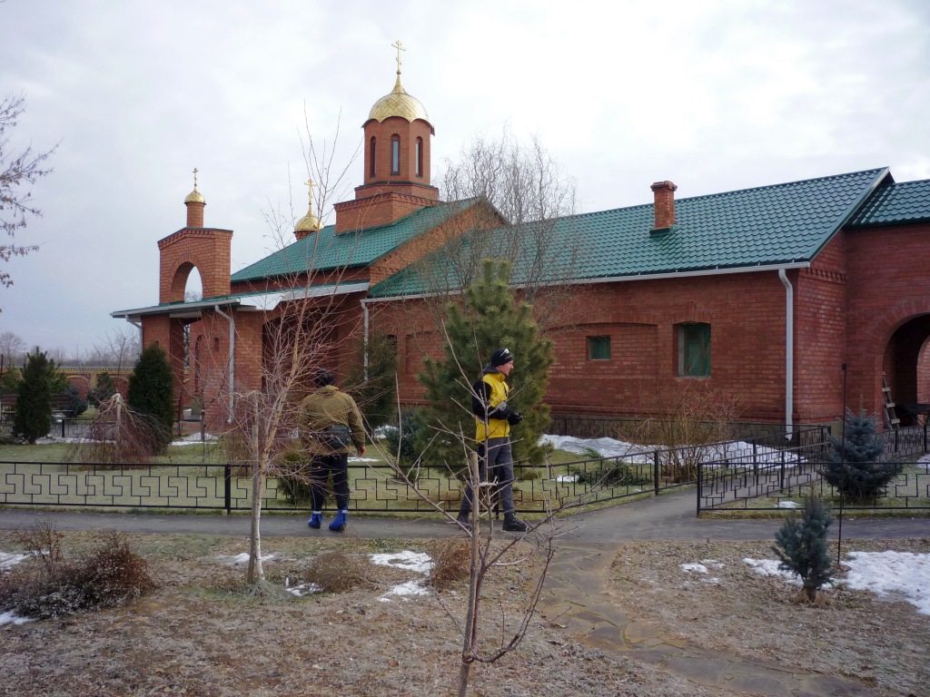 Я рано ложиться за Волгой не привык, потому засиделся у костра. Звезды на небе - не то что с горошину, с яблоко! И лучистые такие... все-таки зимнее небо неподражаемо. И если бы не боль, которая мешала мне запрокинуть голову, я бы долго смотрел на эти звезды. После обеда я с размаху грохнулся левой стороной спины об лед - ноги выскользнули из-под меня так, будто их выбили сильным внезапным ударом. И после этого левая сторона шеи начала болеть, не давая запрокинуть голову и повернуть ее влево. К одиннадцати часам вечера температура упала до минус 16 с половиной градусов. В бархатной темноте перемигиваются заволжские огни, лучится звездами небо, потрескивает костер, ни ветерка... хорошо! Мысли текут неспешно, вокруг тишина, разве что иногда всхрапнет кто-то в палатках, и снова только потрескивание дров в костре да гулкие раскаты - лопается на Волге лед. А с фарватера иногда слышно, как чавкает дизелем судно, с протяжным грохотом ломает лед, и обломки из-под форштевня гремят-катятся наперегонки. Будто идет вдалеке и никак не пройдет поезд. Судно ушло за косу - и снова тишина. Пока я сидел у костра наедине с ночной Волгой, испек в углях оставшуюся картошку - иначе завтра ее, замерзшую в камень, пришлось бы выбросить. Съел одну, выяснил, что получилось вкусно, и пошел спать. Спалось хорошо. Несколько раз я просыпался, но не от холода, а от желания перевернуться на другой бок. И, переворачиваясь, понял, что шея моя решительно возражает против идеи продолжить поездку вниз по Волге. Так что, когда утром пришло время решать, еду я дальше или возвращаюсь, особых сомнений у меня уже не было. Я решил ехать домой со всеми вместе. Но перед возвращением домой мы решили проехать вниз по Волге еще километров пять-семь до Барбашей, чтобы посетить монастырь. И, надо сказать, эти километры скучными не были. Свидетельствую: лед там был высококачественный. Теперь я постоянно болтался в арьегарде, стараясь свести риск падения к минимуму. Пришлось осторожничать, потому что падать еще раз уж очень не хотелось. Погода с утра была почти пасмурной, но когда мы добрались до монастыря, стало проглядывать солнышко. Нам повезло - мы подъехали как раз без минут двенадцать. И только мы вошли на территорию, как звонарь начал вызванивать полдень (или как это правильно называется?). Я даже двух-трехминутный видеоролик снял, со звуком. Осмотрели монастырь и двинули на выезд из Барбашей. И, мало-помалу, добрались до Репинского асфальта. Доехали по асфальту до Кривуши, свернули с асфальта, проехали через село, переехали по льду ерик и выбрались на вал. Планировалось выехать на Ямы, а с них - на Сахарный. Но постепенно выяснилось, что Ямы мы объедем и выедем сразу на Сахарный. Пересекли Рассветовский асфальт. Солнышко уже светило вовсю, так что взбираясь на очередной вал, мы попали в грязь. Южный склон вала солнце прогрело настолько, что и при семи примерно градусах ниже нуля, земля оттаяла. На очередной развилке мы, посомневавшись, все же поехали прямо вместо того, чтобы свернуть влево - и вместо Сахарного выехали снова к Рассветовскому асфальту, на Фрунзе. Время нас уже поджимало, разыскивать дорогу на Сахарный мы не стали, а поехали по асфальту - до поворота на Рассвет, примерно 5-6 километров, и до моста - еще примерно столько же. Около половины пятого мы были на предмостной развилке. Там Tolibanych!!! попр