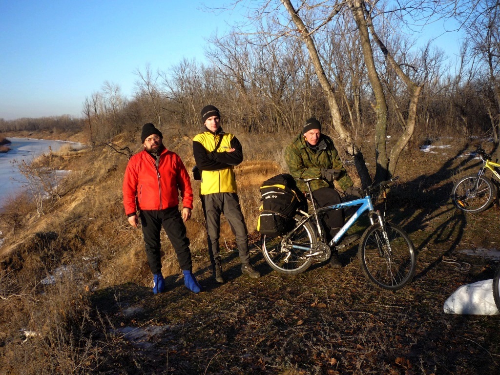 Уже давно тому, кто-то мудрый сказал: Дважды в одну реку не войти. И, конечно же, был прав. Но я все же решил попробовать. Решил сделать что-то вроде поездки в Каршевитое (см. "В Каршевитое и обратно за три дня"). Задумано это было как четырехдневный выезд... куда-нибудь вниз по Волге - куда доеду за два дня. Выехать я планировал 4 января, в первый же морозный день. Но PSV предложил перенести выезд на пятое, чтобы первый день можно было проехать вместе. Он планировал выезд с одной ночевкой, и ехать собирались еще Sasha Pronin и Tolibanych!!!. На том и порешили. Они после ночевки поворачивают домой, а я еду дальше. Но... гладко было на бумаге, да забыли про овраги. С утра 5 января термометр показывал минус 14, небо ясное - все обещало прекрасный день. Дорога по городу и через мост была самой обычной, чистый асфальт, небольшое движение - ничего особенного. В хорошем темпе доехали до Слободы, где к нам присоединился Tolibanych!!!. После закупок в Слободском магазине мы поехали на Сахарный, и я уже сказал себе: Ну, наконец-то я запомню дорогу от Сахарного на Ямы! Наивным я был... До Сахарного асфальт тоже был чистым, и мы как-то очень быстро доехали до места, где надо было сворачивать на грунт. И там взгляду моему представились две извилистые полосы неровного льда, между которыми изредка проглядывала земля. У PSV была четырехрядная шиповка Nokian, у меня - тоже шиповка, и тоже Nokian, только двухрядная. У Tolibanych!!!'а была российская резина, которую он сам зашиповал, изнутри вкрутив в каждый грунтозацеп по шурупу так, что их острые концы торчали наружу и выглядели весьма агрессивно. И только Sasha Pronin ехал без шипов, на мягкой резине, которая под его весом прожималась почти наполовину. Сказать, что по той дороге мы ехали, было бы неверно. Гораздо точней будет сказать, что мы прокрадывались. Даже PSV на четырехрядке на том льду приходилось осторожничать. Мне на двухрядке очень быстро стало понятно, что ехать надо так, будто никаких шипов у меня нет и в помине. Tolibanych!!! на самодельных шиповках ехал уверенней меня, но если была возможность объехать лед, он его объезжал. Только вот возможность такая была не всегда... Падали все. Да и как не упасть, если по дороге, когда она была еще снежной, машины накатали колеи, между которыми остались ледяные гребни? Тут и четырехрядная шиповка не спасет. Я падал чаще, чем ожидал - видимо, и потому, что уж очень давно по такому льду не ездил, и потому, что рюкзак у меня оказался больно тяжелым - я вез продукты на четыре дня, ремнобор и т. д. Мои надежды на шипы не оправдались, все же 2 ряда - мало. Например, в ту гору, которую PSV одолел в седле, я долго и упорно вползал пешком, то и дело замирая в самых нелепых позах. Вел регулярно пытался встать на дыбы и стащить меня вниз, и один раз у него это получилось - мы с ним сползли юзом метра на полтора. PSV в это время, стоя на вершине, увлеченно снимал мою, как он позже выразился, Кама-Сутру с подъемом. Будем надеяться, фотки он выложит. В общем, скучно не было, отнюдь. Было весело и интересно. На удивление уверенно ехал Sasha Pronin. Можно смело говорить, что в его случае качество прокладки между седлом и рулем оказалось на высоте. Несмотря на отсутствие шипов, бОльшую часть покатушки лидировал он. Может быть, отчасти потому, что груз у него, думаю, был небольшим, и вез он свой груз в баулах. Лед, да еще с гребнями - как раз тот случай, когда баул лучше рюкзака. Н