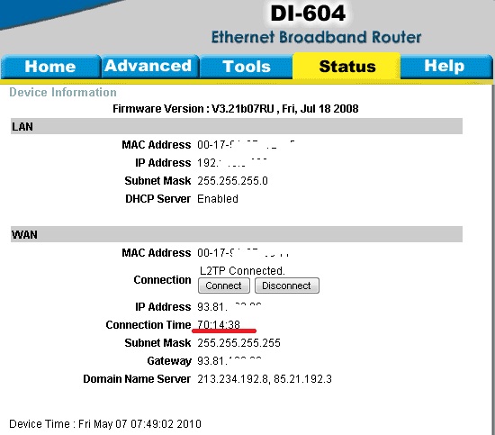 Инета не было примерно час, не заметил, поскольку был не дома Такие перерывы - это ерунда, в общем-то. May 4 09:19:31 pppd[74]: No response to 6 echo-requests May 4 09:19:31 No response to 6 echo-requests May 4 05:19:31 pppd[74]: Serial link appears to be disconnected. May 4 09:19:31 Serial link appears to be disconnected. May 4 09:19:31 L2TP: Disconnected May 4 09:19:36 pppd[74]: Terminating on signal 15. May 4 09:19:36 Terminating on signal 15. May 4 09:19:36 l2tpd[68]: Too many retransmissions on tunnel (64872/48901); closing down May 4 09:19:37 pppd[74]: Connection terminated. May 4 09:19:37 Connection terminated. May 4 05:19:37 pppd[74]: Connect time 21215839.5 minutes. ...................................................................................................... May 4 10:24:39 pppd[265]: primary DNS address 213.234.192.7 May 4 10:24:39 primary DNS address 213.234.192. May 4 10:24:39 May 4 10:24:39 pppd[265]: secondary DNS address 85.21.192.5 May 4 10:24:39 secondary DNS address 85.21.192. May 4 10:24:39 May 4 10:24:40 L2TP: connect to ISP ---------- Сообщение добавлено 04.05.2010 21:14 ---------- А, кстати, видать совсем никто на тормозные Ночные гонки не подключался, тариф, наконец, изменили. Теперь более приятным стал. (0/525) Ночные гонки 2500 / 10000 Кбит/с 525.0 2500 Кбит/с Хоть на гонки стало похоже