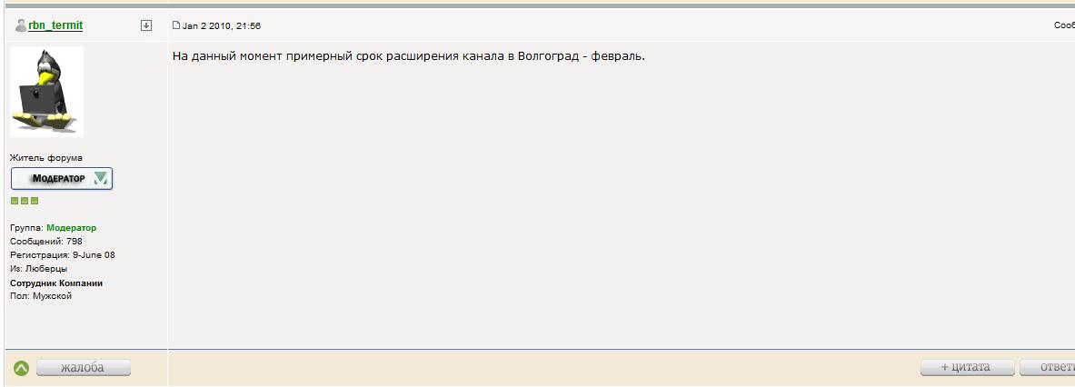 Давайте не будем махать, как флагом на бане, скринами со спидтеста, ихмо те люди которые это делают показывают свою безграмотность и не компетентность в вопросах о реальной скорости интернета. По поводу проседания канала: ДА есть такое дело!!! Никто отрицать не собирается. Мы работаем над сложившемся положением, и в скором времени эта проблема будет решена. В ТП немного погорячились пообещав поправить всё к 12.01 - этого не случиться!!! Счастье будет чуть позже.... Не буду оперировать датами т.к. не в моей это компетенции, но могу сказать одно: "Проблема будет решена в ближайшее время! Не на день-два или месяц, а впринципе решена." P.S. -прошу не задавать мне вопросов по срокам, датам и т.п. Я дал всю информацию которой владею...