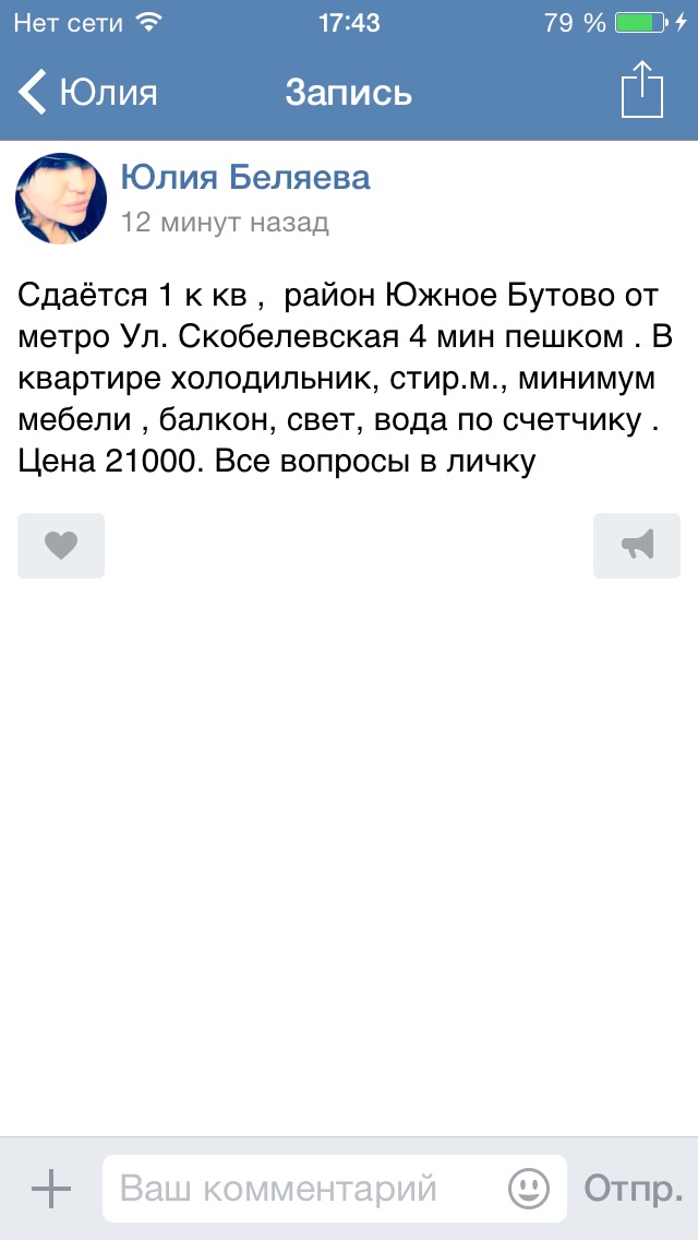 Привет всем! Снова предлагаю обратить внимание на аренду без агентских: 1к-кв, м.Перово несколько минут - тыц. Хозяева адекватны, всегда можно договориться. На форуме я опять редко. Crazy Fox, можно через тебя связь, если что? p.s.: в тему предыдущих постов - на циан выложить стоит 10к (не агентству). Бывает агенты за свой процент поджуливают, уж лучше самому когда время есть. После количества снятых-сданных-проданных уже в их "опыте" и доступе к виннеру/циану надобности нет. Фейсбученька/форумы/вконташ и какой уже раз хорошие ребята заселяются по репостам.