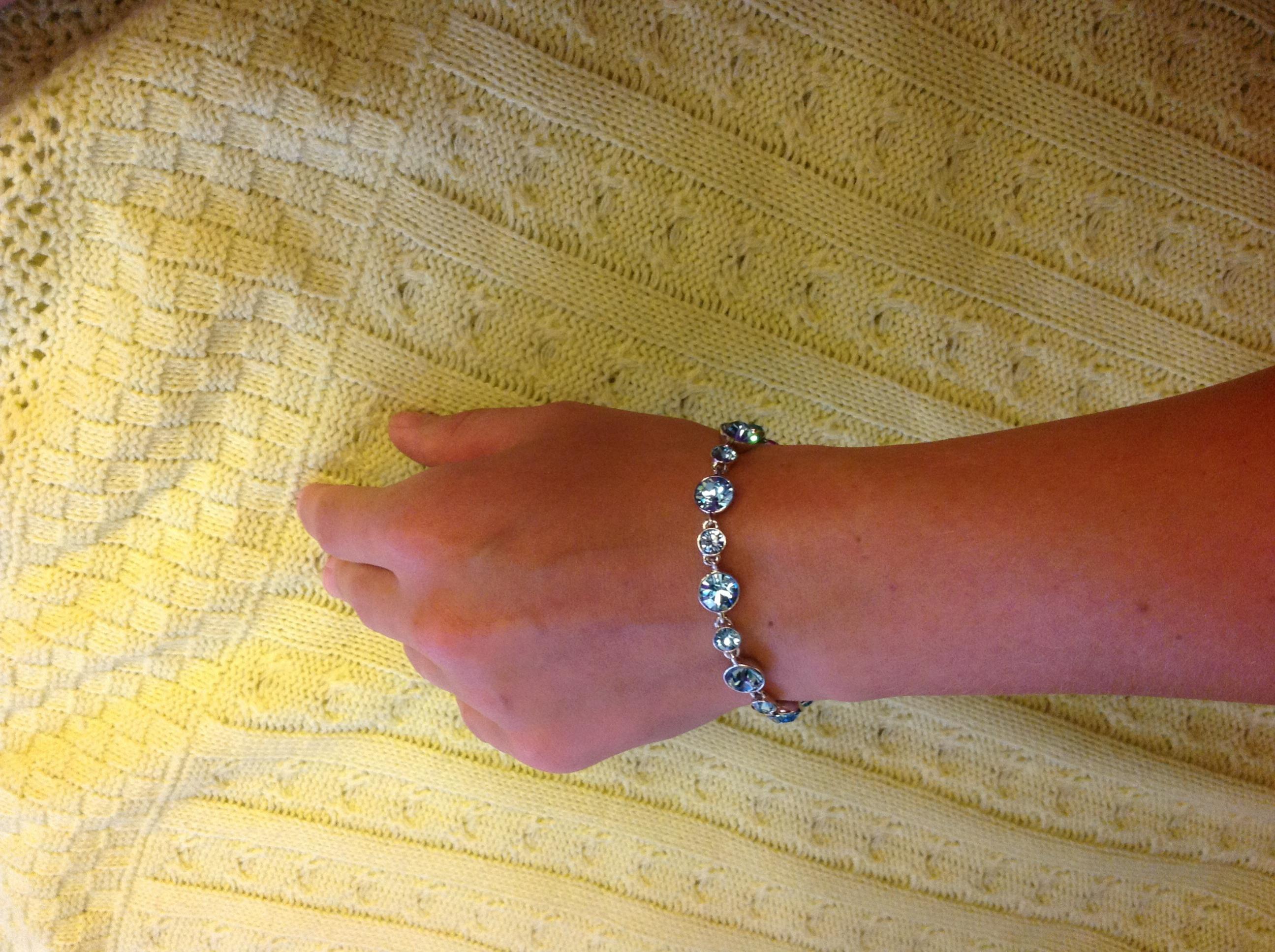 С ценниками на руке. Серый такой же, только серый)) С голубыми камнями, какие там топазы, стразы или как их там. Но смотрится свежо прям