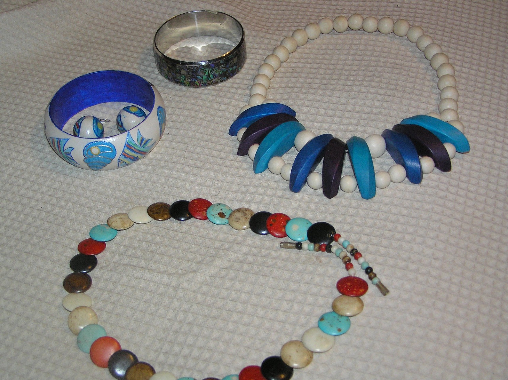 В основном ношу браслеты или кольца. В ушах - ничего, на груди - редко. Как-то прикупила забавный браслет - разноцветные шарики, на них мордахи. И мне тут же надарили похожих бус - тяжеленные, на полкило из кошачьего глаза, и войлочные (на фоте).