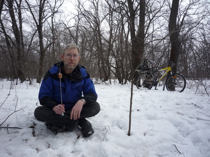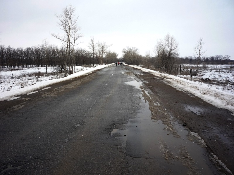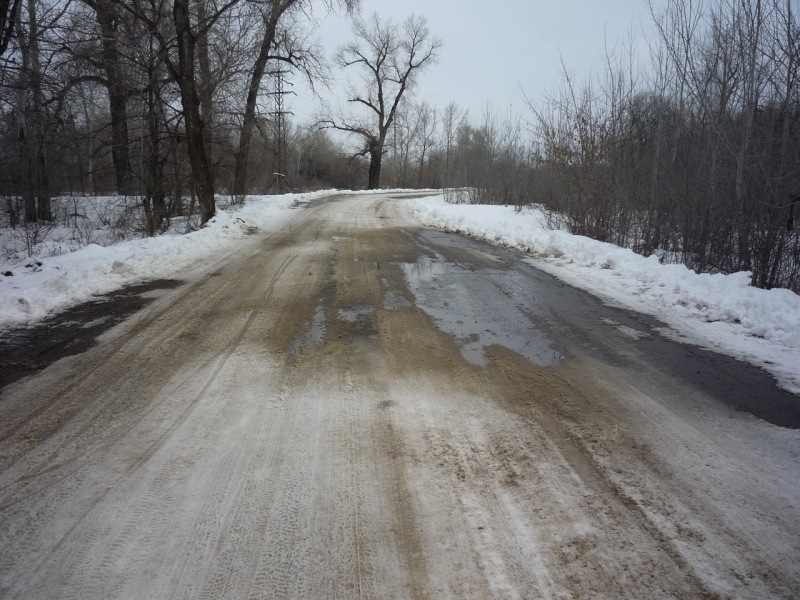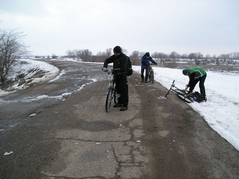 Последняя зимняя, она же первая весенняя, покатушка была вытянута усилиями PSV. Он настолько засиделся, что готов был ехать почти несмотря ни на что. Синоптики на субботу угрожали нам небесными карами - пасмурно, мол, будет, небольшие, мол, осадки весь день, да и ветер ажно 7 м/сек... Вроде как и нельзя ехать. Но если нельзя, но очень хочется, то - можно. Мне-то проще, я, считай, каждый день езжу. А вот PSV выехать хотелось очень. Забегая вперед, скажу: когда в двенадцатом часу выглянуло солнышко (мы в это время подъезжали к Ямам), я понял, что если бы с утра я и остался дома, то не усидел бы, увидев в окошко такую благодать. Да, с погодой нам повезло. Было солнышко, пусть не так уж долго, ветер был не только встречный, но порой и попутный, было тепло. Впрочем, хорошо ли, что было тепло - вопрос сложный... Итак, к 10:00 вся четверка была в сборе. Были PSV и tRIDENT, а ники еще двоих - по-моему, Shamano (Алексей) и Power CMW (Олег). Если я ошибся, приношу извинения. По мосту поехалось хорошо, так что, начав с умеренной скорости 23 км/ч, к концу моста мы раскатились до 28. Луж не было, был мокрый асфальт. Проехали мост, проехали пост ДПС, одолели подъем-тягунок и свернули к дамбе через Верблюд. Там нам встретился первый на нашем пути снег. Ночью, похоже, был небольшой минус, потому через дамбу мы проехали достаточно легко - укатанный снег еще как-то держал. А вот на подъеме за дамбой он уже начал расползаться под колесами, вел начало бросать - то одному, то другому приходилось периодически останавливаться, забурившись передним колесом в кашу. Дорога от пионерского лагеря до Среднеахтубинской трассы была примерно в таком же состоянии - приходилось ехать строго, избегая шевелить рулем. Перевалили через Среднеахтубинку и поехали к Сахарному. На вопрос "Сусанин, куда едем?" PSV глубокомысленно ответствовал: "А ... его знает...". Асфальт до Сахарного тоже был почти весь покрыт мокрой снежной коркой, которая норовила расползтись под колесом, но держать около 20 было нетрудно. Доехали до Сахарного и повернули направо, в поля. Дорога стала получше, снег еще держал - пока дорога шла по лесочку. А когда мы выехали на открытое место, где дорогу овевал ветерок, пришлось переключиться пониже и поработать как следует. За каждым из нас, как за пароходом остается кильватерный след, тянулась пробитая, продавленная, прорытая в плотном снегу канавка, выписывающая причудливые зигзаги. Будто пьяный ехал... Выехали на взгорок перед самыми Ямами и остановились передохнуть - взмокли. Появилась возможность оглядеться, которой мы тут же воспользовались. И восхитились - до чего же хорошо! Солнышко выглянуло, легкий ветерок, теплынь - и ощутимо пахнет весной. А под колесами - пусть усталый, ноздреватый и мокрый, но все же снег. Порог... Порог между уходящей зимой и накатывающейся весной. Поснимали шапки, кто-то снял лишнюю куртку, я и рукавицы снял. Знаете, очень непривычно было держаться за руль голыми руками, странно как-то... Мимо Ям пришлось ехать, по-прежнему притворяясь ледоколами. А солнышко-то пригревает, а теплый ветерок веет... как же нам дальше-то ехать придется? Недалеко за Ямами остановились на перекус с костерком. С хрустом и треском вломились в кусты, причем неугомонные Лёха и Олег в кусты нырнули, не слезая с велов. Нашли подходящую низинку среди деревьев, где ветра почти не было, развели костерок, перекусили, чем Бог пос