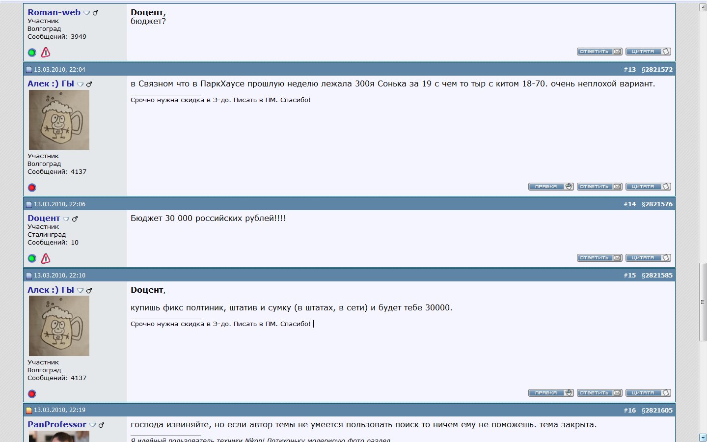 ябы сказал не намекает а практически открытым текстом говорит. почувствуйте разницу. сегодня человек создает тему "Зеркалка для новичка (какую выбрать?)" страницей ниже есть тема "Вопрос по зеркалкам начального уровня (вопрос новичка)". много разного в темах? зачем создавать практически дубль темы? незнающему может показаться что я перебарщиваю, но посмотрите на ту гору ссылок которые я дал человеку только на те темы по выбору зеркалок которые обсуждались в последние три месяца http://www.forum-volgograd.ru/showthread.php?p=2821605#post2821605 . неужели этого мало? а вот представьте что в разделе авто каждый второй будет создавать одну и туже тему "какую машину за 200тр купить?". много разного ему посоветуют? или что за два дня появились новые модели зеркалок (машин) в данном сегменте? поэтому просьба не поднимать ненужного обсуждения и не высасывать из пальца проблему где ее нет. закрытие темы-дубля это обычная рабочая ситуация. Алек ГЫ, заметьте, в том г... как вы сказали я не написал ни одного грубого слова в отличие от вас в данной теме. и еще вопрос кто вирус из нас а кто нет.