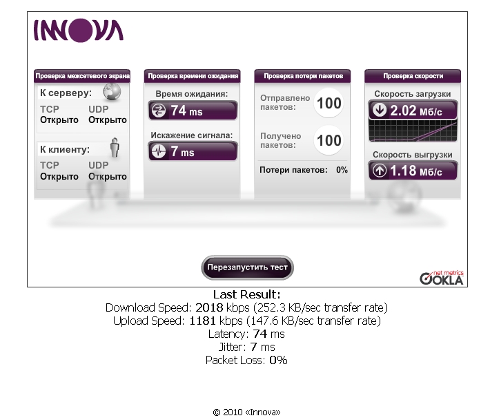 Lextor, благодарю... что то пинг и скорость скачет.... у одного был пинг 40 но скорость 1мбит а у вас 2 мбита и пинг как на билайне 74 ---------- Сообщение добавлено 20.09.2010 18:03 ---------- Народ а как сейчас дела обстоят с обрывами на мультинексе??? Со скоростью как дела? Если можете измерьте скорость на спид тесте.