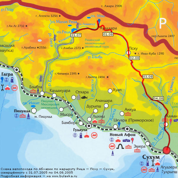 Место проведения – Абхазия. Горы/озера/реки... в конце похода море. Поход не прогулочный (по крайней мере часть №2!)- морское побережье в этот раз не главное… Сроки- ориентировочно [/U]прибытие в Адлер – 17-18 июля, убытие оттуда же 30-31 июля. _________________________________________________________________________________________________ Маршрут: (наименования городов/сел/озер и т.д - см рисунок - на даты не обращайте внимания...) Часть1 (общедоступная) – Адлер- Гагра- Рица- малая Рица-Авадхара-озеро Мзы - Авадхара-перевал Анчхо - Долина шести озер. Длительность – порядка 5 дней. Участки где придется не ехать, а вести/толкать вел в гору – будут. Их протяженность за день будет составлять порядка 5-6 км (От Рицы до малой Рицы – возможно без великов, от Авадхары в сторону озера Мзы, от перевала Анчхо до шести озер) – это по сути дела будут радиалки – сегодня поднимаемся – завтра там же спускаемся.. Остальной путь я даже будучи почти в невменяемом состоянии смог проделать не слезая с велика (а исключением озвученных выше трех эпизодов. Все велосипедные участки (там где мы едем а не толкаем вел пешком) (до Авадхары) представляют собой асфальтовое покрытие - где-то просто великолепное, как на участке от границы и до точки с которой начинается подъем на Рицу, где-то чуть хуже (весь подъем вплоть до Рицы), где-то разбитый от времени и непогоды «почти асфальт»… Так же будет иметь место и грунт – в основном каменистый/щебенчатый. Путь до малой Рицы и до Мзы – тропы – соответственно в основном грунт/земля. Чего-то сверхсложного на участке до перевала Анчхо (см. описание на сайте Ориона за 2008 год) вроде нет. Для тех кто не уверен в своих силах на этом "спортивная" составляющая похода может благополучно завершиться - спуск к морю занимает порядка 4 часов Часть 2 Долина шести озер - перевал Анчхо – село Псху - Сухум Длительность порядка 5 дней. Пополнить запасы провианта после Псху возможно будет негде, людей можем не встретить вовсе…. Участок после перевала Анчхо – не совсем проработан – уточню позже, но по предварительным данным до Псху – гравийка , а вот от Псху до Сухума – возможно только тропы. Часть 3 – Отдыхательная –Сухум - Новый Афон – Гагра – Пицунда - Адлер. 2-3 дня. (для тех кто осилит лишь первую часть – отдыхательная часть начнется сразу после долины шести озер – спуск на побережье). Части 2 и 3 могут корректироваться в зависимости от погодных условий и иных непредвиденных обстоятельств. Как вариант – доехать до Псху и вернуться тем же маршрутом через Анчхо, после чего приступить к отдыхательной части досрочно, с посещением Гегского водопада, и иных достопримечательностей, коих в Абхазии предостаточно. ______________________________________________________________________________________________________________________________ ++ Приблизительное описание первой и третьей частей маршрута есть по ссылке: http://orionvelo.narod.ru/trips/reports ... _aug08.htm ++ Вторая часть описана в рассказе по ссылке http://www.bulawka.ru/