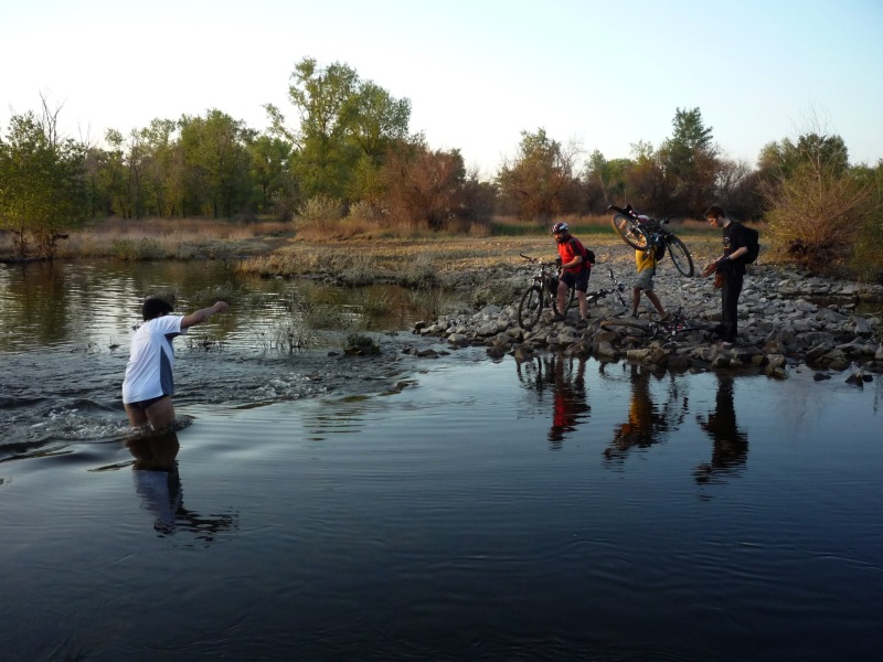 Покатушка состоялась. И если кто-то не поехал потому, что поленился, то - зря. Было здорово. Стартовали мы от Европы в 18:35. По мосту ехали в темпе, начали с 23 км/ч, к концу моста раскатились до 28. По среднеахтубинской трассе проехали от заправки километра полтора-два и ушли влево, к Верблюду. Вода в нем упала сантиметров на 70 по сравнению с 9 мая, и тот участок дороги, что во вторник едва освободился от воды, сегодня был почти сухим. Вдоль Верблюда по грунтовкам мы доехали до Старенького, держа 18-24 км/ч. Железный мостик, что в овражке за Стареньким, оказался не только сухим, но был сантиметров на 30 выше воды. Я думал, там проехать не удастся. В паре мест за мостиком, по пути к Волге, на дороге была грязь, но мы легко объехали ее по траве. В основном дорога была в отличном состоянии, сухая и ровная - приятно ехать. Вскоре мы выехали на вал, огораживающий рыборазводные чеки, и по нему доехали до Волги. Часть вала усыпана крупным щебнем, пришлось попрыгать. Возле Волги мы поразмыслили, ехать ли сразу к верхней дамбе Верблюда, или сначала глянуть, что творится в устье Верблюда. Решили глянуть. Через 10 минут увидели дорогу, ныряющую в воду, и повернули к верхней дамбе. Издалека дамба выглядела сухой... но только издалека. Когда мы подъехали поближе, то увидели, что паводком размыло насыпь из крупных камней, ведущую к бетону, и вода шурует из Верблюда в Волгу, отрезая нас от бетона. И хорошо шурует! А нам надо на бетон... Вода была не особо холодная и прозрачная, слив гладкий, и камни были хорошо видны. Да и глубина - чуть больше чем по колено... но гряда камней была узенькая, а камни под ногами качались и были острыми. Вот только все это я выяснил позже, а сначала отнесся к броду несерьезно - и едва не поплатился за это. Я недооценил напор и глубину воды, и вместо того, чтобы поднять вел как можно выше, взял его одной рукой за нижнее перо задней вилки. Колеса оказались при этом опасно близко к воде. Мне помогло то, что раньше я ходил через горные речки и точно знал: спешить, делать резкие движения и разуваться нельзя. Потому, когда камень ушел из-под ноги, я плавно отклонился в сторону, восстанавливая равновесие, и хотя колеса вела на треть ушли в воду, это произошло медленно. Сразу же стало трудней стоять, колеса здорово парусили. Поток начал стаскивать меня с каменной гряды на глубину. Если бы колеса окунулись резко, я бы не устоял. А так я поймал равновесие, плавно поднял вел, вытащив колеса из воды, как следует присмотрелся, куда поставить ногу, и медленно сделал шаг, потом другой... Еще два раза колеса окунались в воду, еще два раза я ловил равновесие - и оба раза поймал. Думаю, будь я босиком - поймать не удалось бы. И только когда я выбрался на бетон, спохватился - мобильник и фотоаппарат лежали в моей поясной сумочке, а я про это даже не подумал! Пока я доставал фотоаппарат и включал его, мимо меня попытался проплыть башмак Wide. Мне удалось его поймать - возле моего берега течение было потише. Потом народ по одному переправился, и все прошло в целом благополучно. Наши потери - Wide шел босиком, потерял равновесие и намочил часы, которые тут же отключились, да уплыл один из моих шлепанцев - мы какое-то время видели его, но там было, пожалуй, уже по грудь. И мы решили отпустить его с миром - может, до Астрахани доплывет? А то и до Каспия... Дальше мы свернули от дамбы вправо, к Волге, и вскоре на 