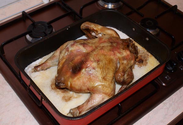 Лично я попрактикизировала и подробно все расписала, могу ишо раз и не развалюсь. Курица была охлажденная и свежайшая. Соль была крупная в количестве 1 кг. Сковородка была не впритык к курице, но слой соли получился толстый. Курица грузилась в холодную духовку. Нагрев сверху и снизу, t 200. Через 40 мин. курица не готова - смешная я, пойду поржу.