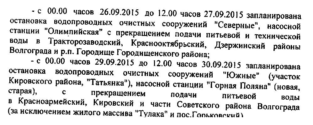 Горводоканал Волгограда в ближайшие выходные проводит последнюю в летнем сезоне плановую остановку водоснабжения в городе. Как сообщили ИА "Высота 102" в пресс-службе предприятия, с 00.00 16 мая до 12.00 17 мая будут остановлены ВОС "Центральные" и насосная станция "Елабужская". На это время будет прекращена подача питьевой воды в Центральный, Ворошиловский, часть Советского района (жилая застройка Тулака), Дзержинский (пос. Ангарский), Краснооктябрьский ("Научный городок") районы Волгограда.