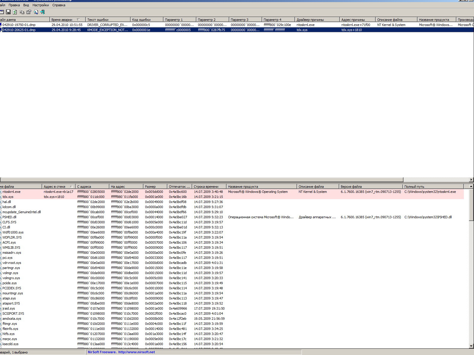 Стояла у меня win 7 х86 и 4гб памяти, было 2 винта на 250 и 500гб купил винт на 1Тб, поставил его начал инфу скидывать с тех... вот как поставил в ходе работы было пару раз что выскакивал синий жкран смерти, ну я решил переставить наконец винду до win 7 64 bit поставил, проработала она 4 дня и вот сегодня снова началось, пока спал 2 раза Bsod вылетел... Помогите разобраться в чем дело может быть...думаю чтото с винтом дружить не хочет у меня, заранее спасибо о системе: asrock P55 extrim+s1156 3500, видео хт1600про, разогнано в биосе немного но эт давно и все стабильно работало... з.ы. скрины прилагаю...
