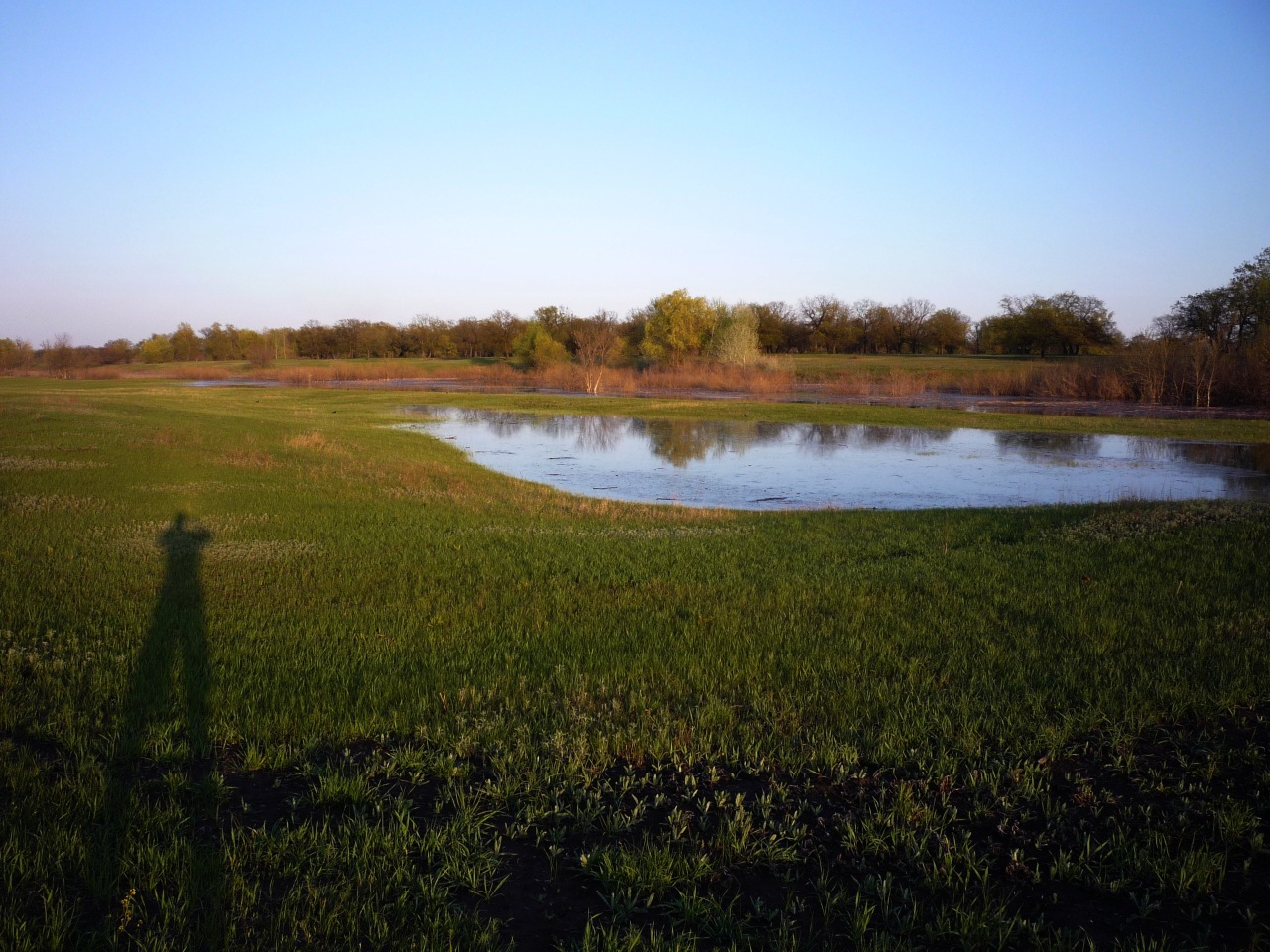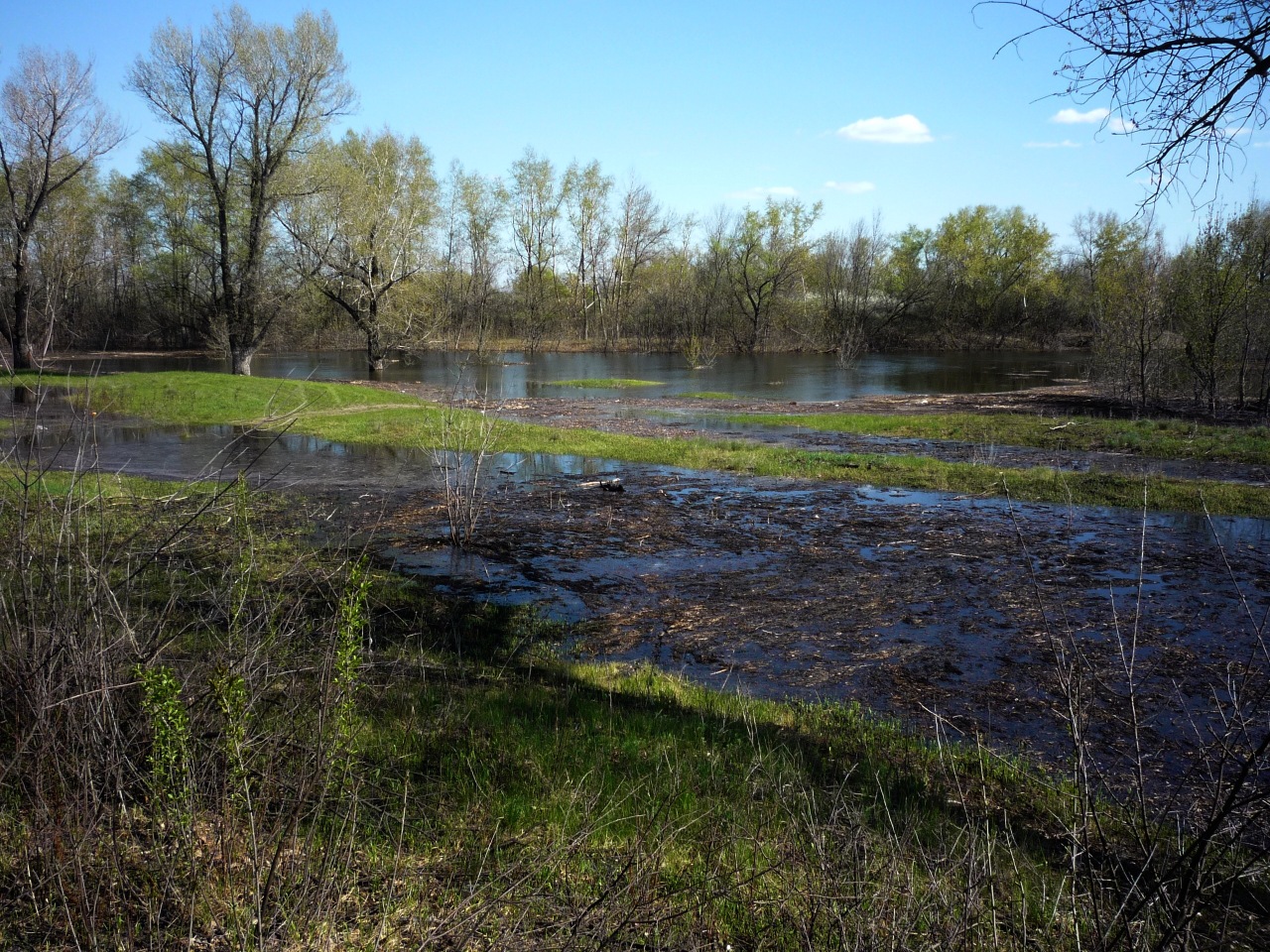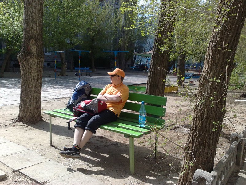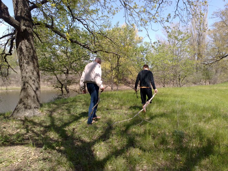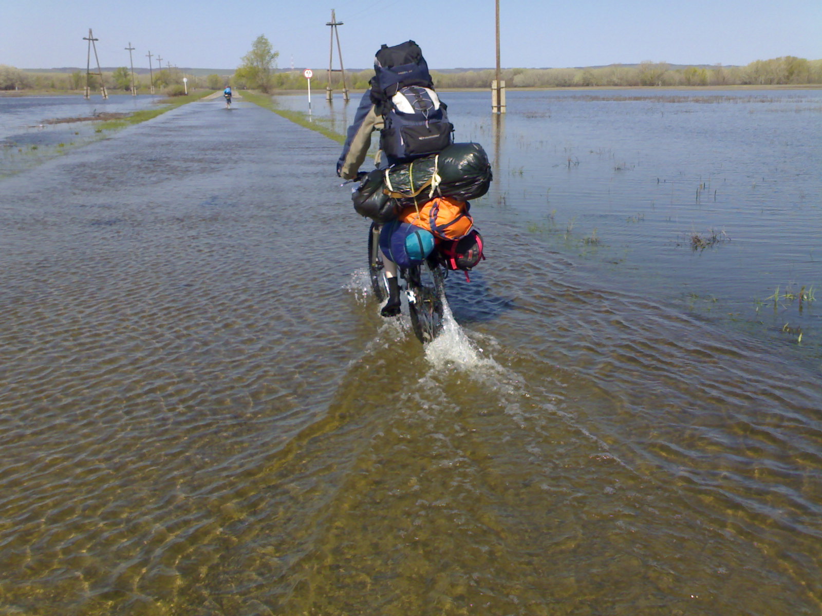 Из дома мы с женой выехали в районе 16 часов 1 мая. Для нее этот выезд - первый в этом году, и мы решили ограничиться тридцатью километрами. Ехали через Сахарный на Нижние Ямы и дальше - на Грязный затон. По пути туда я все ожидал, что одна из низин будет залита, но до Ям мы доехали посуху. Правда, дамба, ведущая в Нижние Ямы, была всего сантиметров на 15 выше уровня воды. Доехали нормально, если не считать прокола двух колес у нее и двух у меня. Неосторожно съехали с дороги... Проехать к самому Грязному затону мы не смогли - в одной особенно глубокой балочке уже была вода. Немного, можно было и перебраться, но ведь возвращаться-то завтра как-то надо? А завтра будет уже не немного. Потому встали на низинке, идущей параллельно Грязному затону и уже превратившейся в ерик. Через час подъехала машина, мужики накачали лодку и поехали ставить сети. Дневальный, занятый костром, явился к нам и попросил клок газеты - разжечь костер. Костер я им разжег горелкой. Потом вернулись лодочники, открыли закрома... Когда, уже около часа ночи, мы ложились спать, гулянка у их костра, метрах в 40 от нашего, была в разгаре. Но не вопили, не дрались и к нам больше не приходили. Разве что около четырех утра двое протащили рядом с нашей палаткой сухое дерево, громко топая, хрустя и нецензурно что-то обсуждая. С утра состоялся ремонт колес. В колесах своей половинки я просто поменял камеры, чтобы не клеить латки - я теперь понял, что герметик ей в камеры залить все же надо, мне же будет меньше хлопот. А приклеенные латки от герметика отваливаются. Из своего переднего колеса я вынул старого доброго "ёжика", и герметик с блеском залатал дырку. А вот с задним вышло хуже. Я извлек из него две тааааких колючки... куда там ёжикам! Такие колючки бывают на ветках. Длиной эти жуткие звери были по два сантиметра, а диаметром в основании - заметно толще спицы. Герметик и тут справился... почти. Если после извлечения этой жути колесо спустило за 15 секуню, то после двух подкачиваний оно спускало за 15 минут... но - спускало. А переднее залаталось сразу. Может быть, мне не повезло в том, что дырка в покрышке затянулась раньше дырки в камере? Я снял колесо, отнес его к воде и проверил методом погружения. Через покрышку - ни пузырька, а выходил воздух рядом с вентилем. Когда я разобрал колесо, выяснилось, что возле вентиля камера в порядке, а сочится воздух через прокол от колючки, но поскольку прямого хода наружу ему нет, т. к. дырка в покрышке уже затянута, воздух просачивался между покрышкой и камерой и выходил возле вентиля. И, похоже, просачивался он слишком медленно. По моим наблюдениям, герметик полимеризуется, когда пузырится и бурлит. А тут было не пузырение, а слааабенькое просачивание, и я думаю, этого для полимеризации не хватило. Очень может быть, что если бы я подкачал колесо еще раза три, дырка бы и затянулась, но запасная камера у меня была, а качать по жаре было лень. Возвращаясь через Нижние Ямы, мы уткнулись в поток на месте вчерашней дамбы. Повернулись и, солнцем палимы, поехали в Верхние Ямы, через которые проходит грейдер Фрунзе - Тумак. Вообще-то в Верхних Ямах есть еще одна дамба, и проехать на Сахарный можно было бы через нее. Но в селе нам подсказали, что по дамбе из Ям выехать еще можно, а вот удастся ли доехать до Сахарного - бааальшой вопрос... по пути ведь и другие низины есть. И мы решили, не искушая с