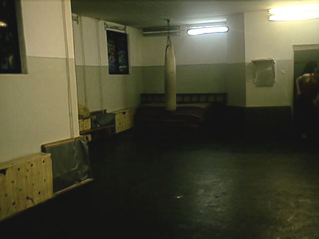 В 18:00 начало тренировки. Если придут начинающие ученики - будет полноценная разминка, а затем тренировка. Тут кто-то интересовался какого размера зал. Вот выкладываю фото из дальнего угла зала. За грушей видна куча поролоновых матов, которые застилаются дерматином. Правее - раздевалка.