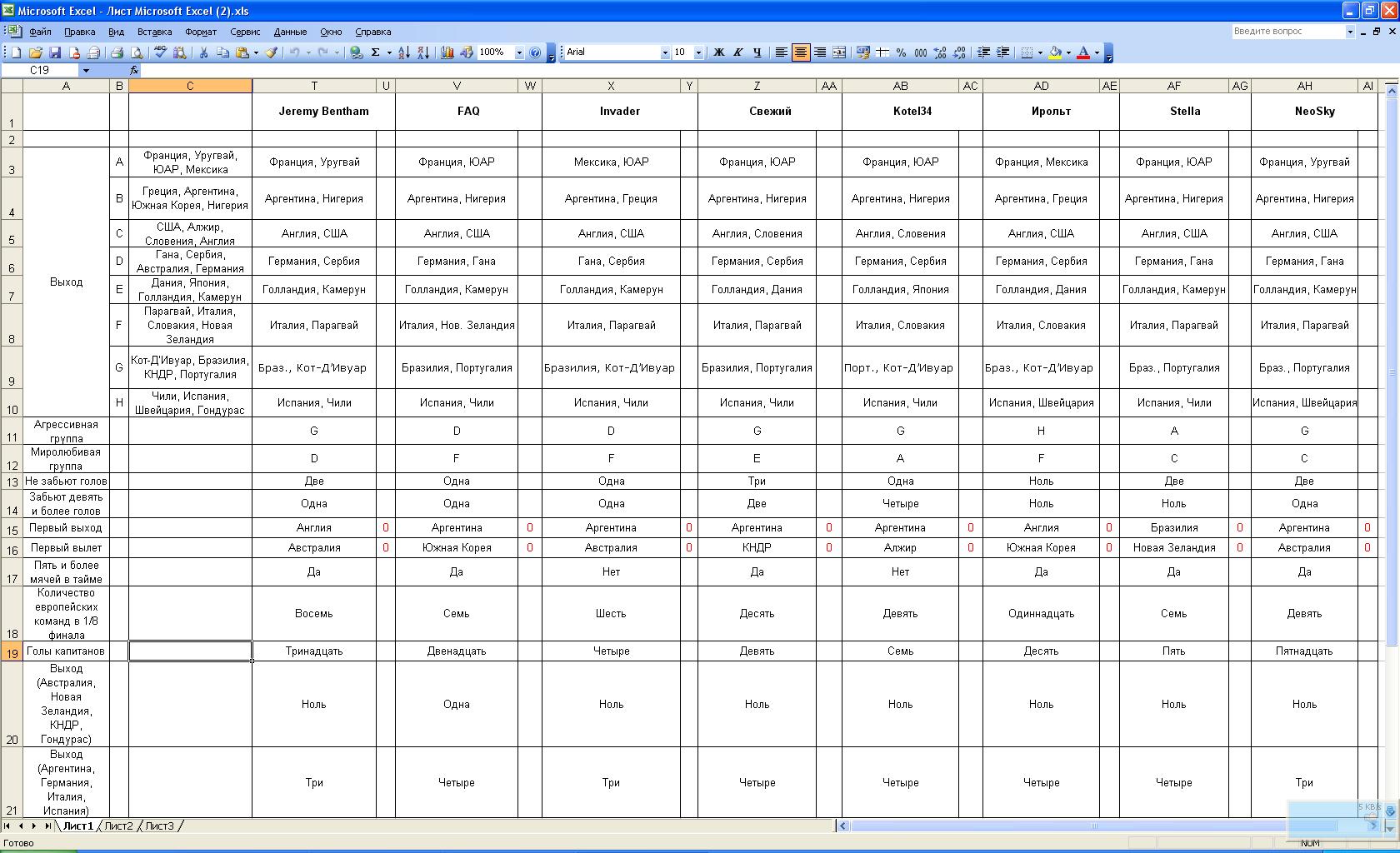 Litron, причём тут медали? Прогноз все давали на команду, которая первая гарантирует выход из группы и первая, которая провалится. ---------- Сообщение добавлено 20.06.2010 13:01 ---------- Греция неожиданно победила. Сыграли бы вничью, семь человек получили бы баллы за Аргентину. P.S. Kotel34, да уж... Пятая группа по счёту, но ни в одной из первых четырёх не было раскладов 6-6-0-0 или 6-4-1-0. ---------- Сообщение добавлено 20.06.2010 13:06 ---------- У меня большая просьба к каждому, кто принимает участие в этой ветке. Если у кого-то есть 20-30 свободных минут, подсчитайте, пожалуйста, голы капитанов. По моим сведением, сейчас их пять. Правильно?