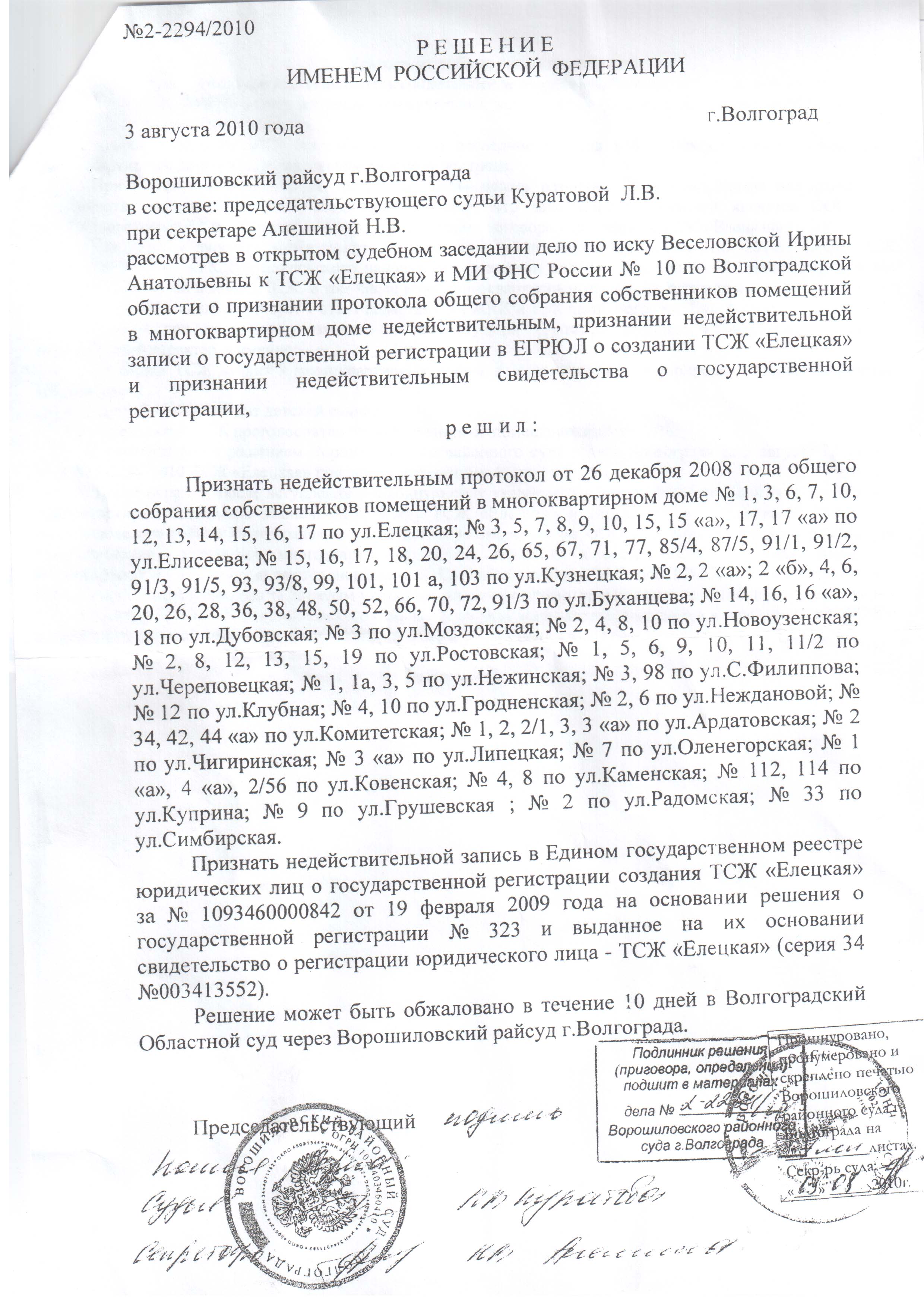 Сегодня пришла ксива от ГУЖК. По которой РЕШЕНИЕМ СУДА отменено ТСЖ "Елецкая" и соответстсвенно все их договоры с УК "Ворошиловского района". Прикольно - решение суда против решения департамента ЖКХ. Кто прав кто нет - сам черт не разберет. А скорее всего обе УК собирают деньги незаконно.
