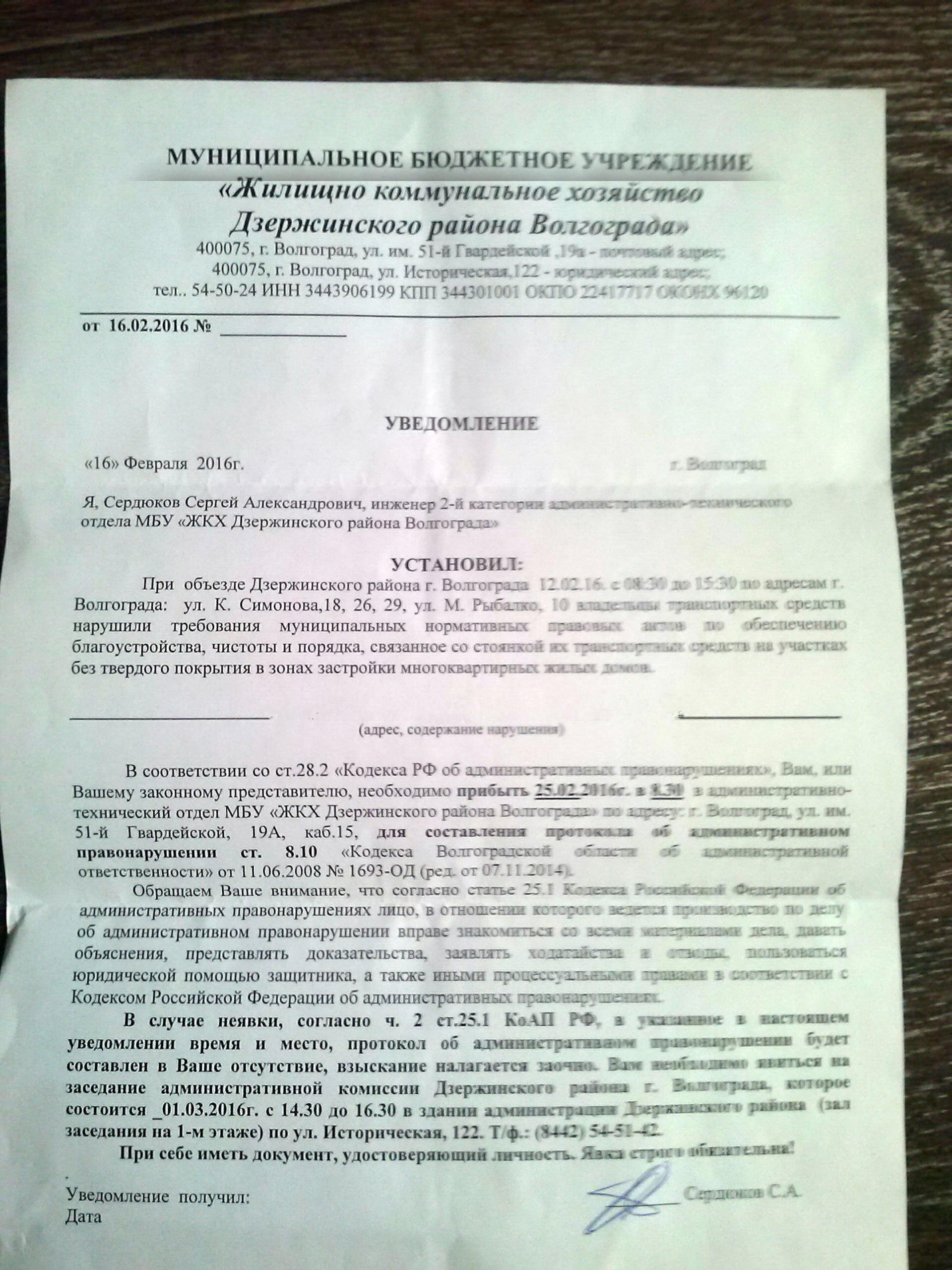 Внимание родителей детей из Школы №33 Дзержинского района г. Волгограда. Осуществляя парковку около школы №33 для высадки или посадки детей, Вы (и я) нарушаете ст.8.10 Кодекса Волгоградской области об административной ответственности. Сегодня пришла бумажка за подписью инженера 2-й категории административно-технического отдела МБУ "ЖКХ Дзержинского района Волгограда" Сердюкова Сергея Александровича. Фото места преступления прилагаю.