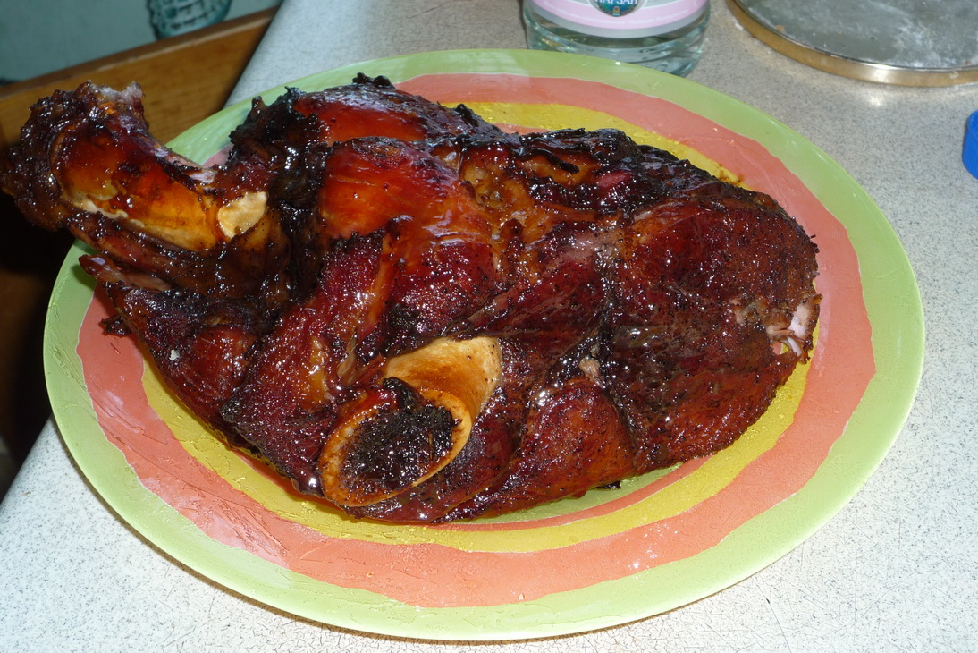 Попробовала как-то я это в Праге - просто влюбилась в сей шедевр чешской кухни! Как-то все руки не доходили, но потом звезды раскинулись по правильному - жгучее желание приготовить совпало со временем, нашлась нужная рулька и бла-бла-бла. И это было так. Чего нам понадобится (т.е. ингридиенты): рулька (кусок от середины голени до середины бедра, лучше передняя нога) - 1 шт. (у меня была относительно маленькая - 1,3 кг); чеснок - 5-7 зубчиков; для рассола: перец (черный, душистый) - по 15 горошин ; имбирь (свежий) - около 2 см; мускатный орех - 1/2 ч.л.; лавровый лист - 5 шт.; пиво (светлое) - около 3л (если рулька больше, то и пиво тоже соответственно больше); соль - 1 ст.л.; для натирки: растительное масло - 1-2 ст.л.; соль - по вкусу; перец (смесь черного и душистого); для глазировки: мед - около 100г; соевый соус - 40 мл; Итак, поехали! Я рульку почистила, промыла, после чего обсушила полотенцем. Зубчики чеснока нарезала тонкими длинными брусочками, а потом ножом протыкала рульку и вставляла в энти дырдочки кусочки чеснока. Потом смолола горошины перца, смешала с солью, добавила остальные специи (имбирь у нас очищается и нарезается тонкими пластинками прямо перед маринованием, чтобы из него весь смак не ушел). Далее пряную смесь насыпаем на дно емкости, в которой будет мариноваться рулька. Укладываем туда рульку, посыпаем оставшейся половиной пряной смеси и заливаем пивом. Накрываем емкость крышкой и убираем на сутки в холодное место. И вот, сутки прошли, время икс близится. Рульку перекладываем в дуршлаг, даем рассолу стечь, смазываем растительным маслом, посыпаем перчиком (эта доп.острота на любителя), после заворачиваем в несколько слоев фольги и кладем в форму для запекания. Во многих рецептах указано, что надо запекать при температуре 60 С. Я посчитала ее слишком низкой и поставила 100. В таком режиме рулька у меня томилась где-то 1.5-2 часа, я ее каждые 30 минут переворачивала на другой бок. Затем увеличила огонь до 200С и запекала еще около часа. После чего вынула рульку, сняла фольгу, намазала глазировкой - смесью меда с соевым соусом - и поставила ее подрумяниваться еще где-то на 20-30 минут (для быстрого схватывания хрустящего румянца на рульке я увеличила температуру до максимума). На этой стадии очень важно почаще поливать рульку вытапливающимся соком-жиром-глазурью, тогда она не пересохнет и будет офигенно красивой. Подавать можно с чем хочешь - я это делала просто со свежими овощами. Хотя для усиления эффекта и для полного погружения в неповторимость чешской кухни можно с тушеной квашеной (или просто тушеной свежей) капустой. Или вообще можно выпендриться и забабахать кнедлики. Нам было ужасно вкусно!