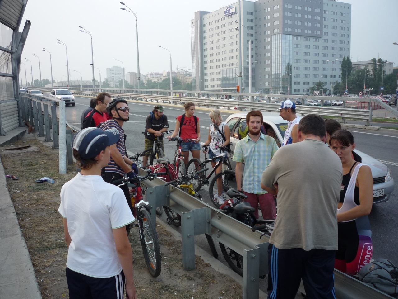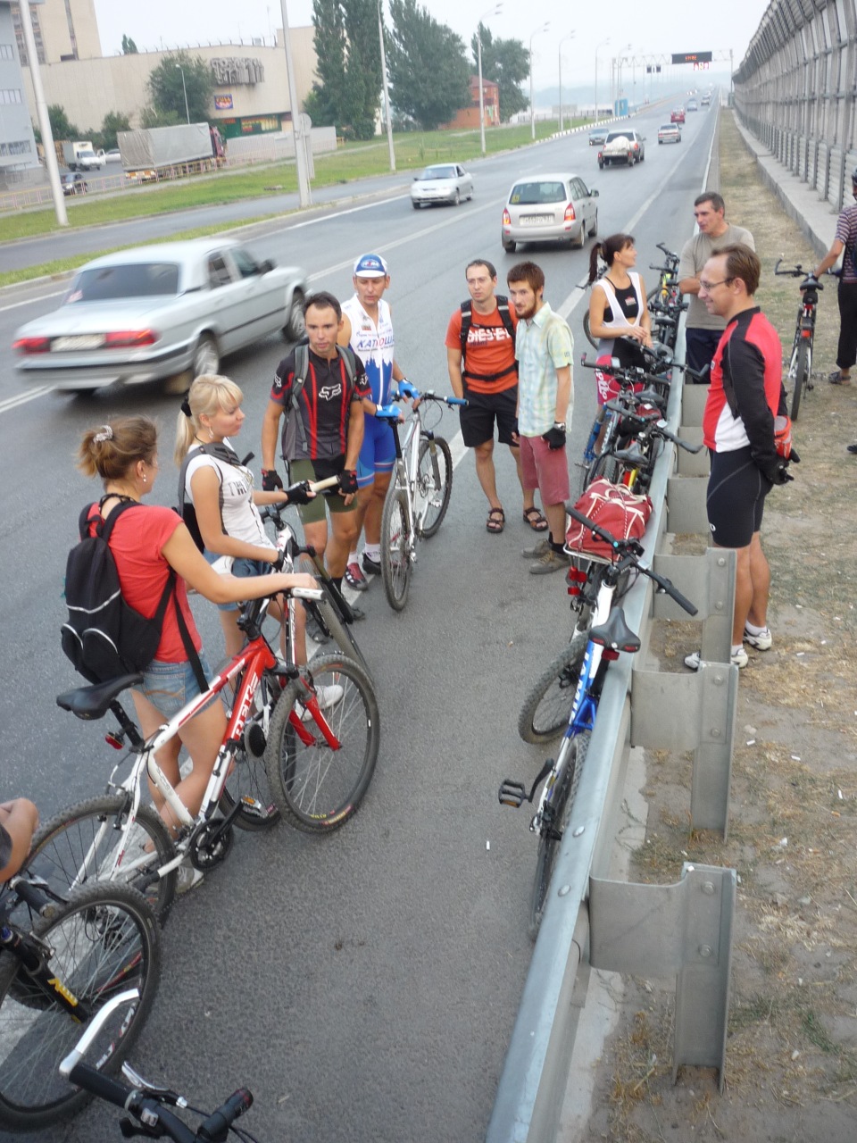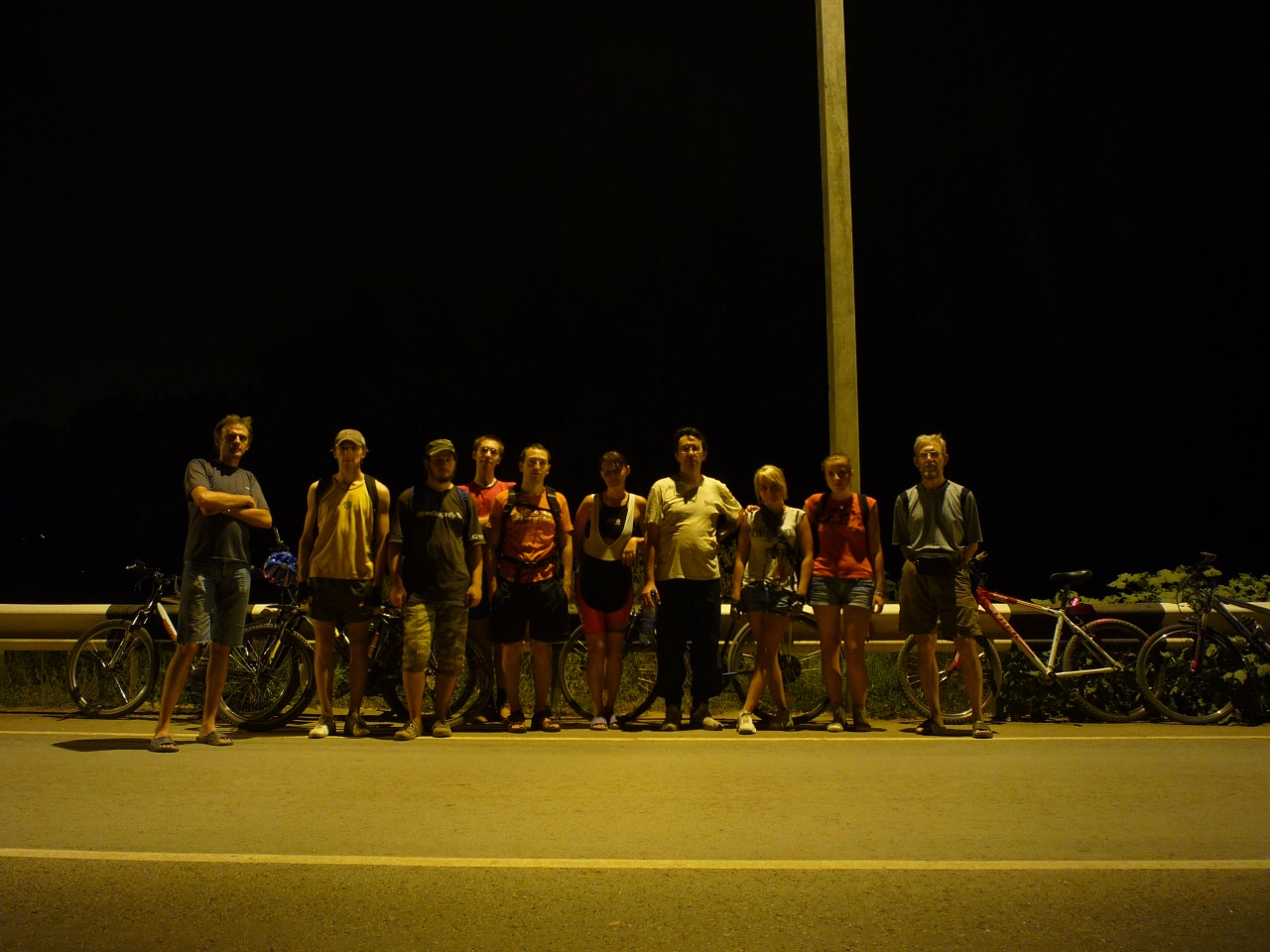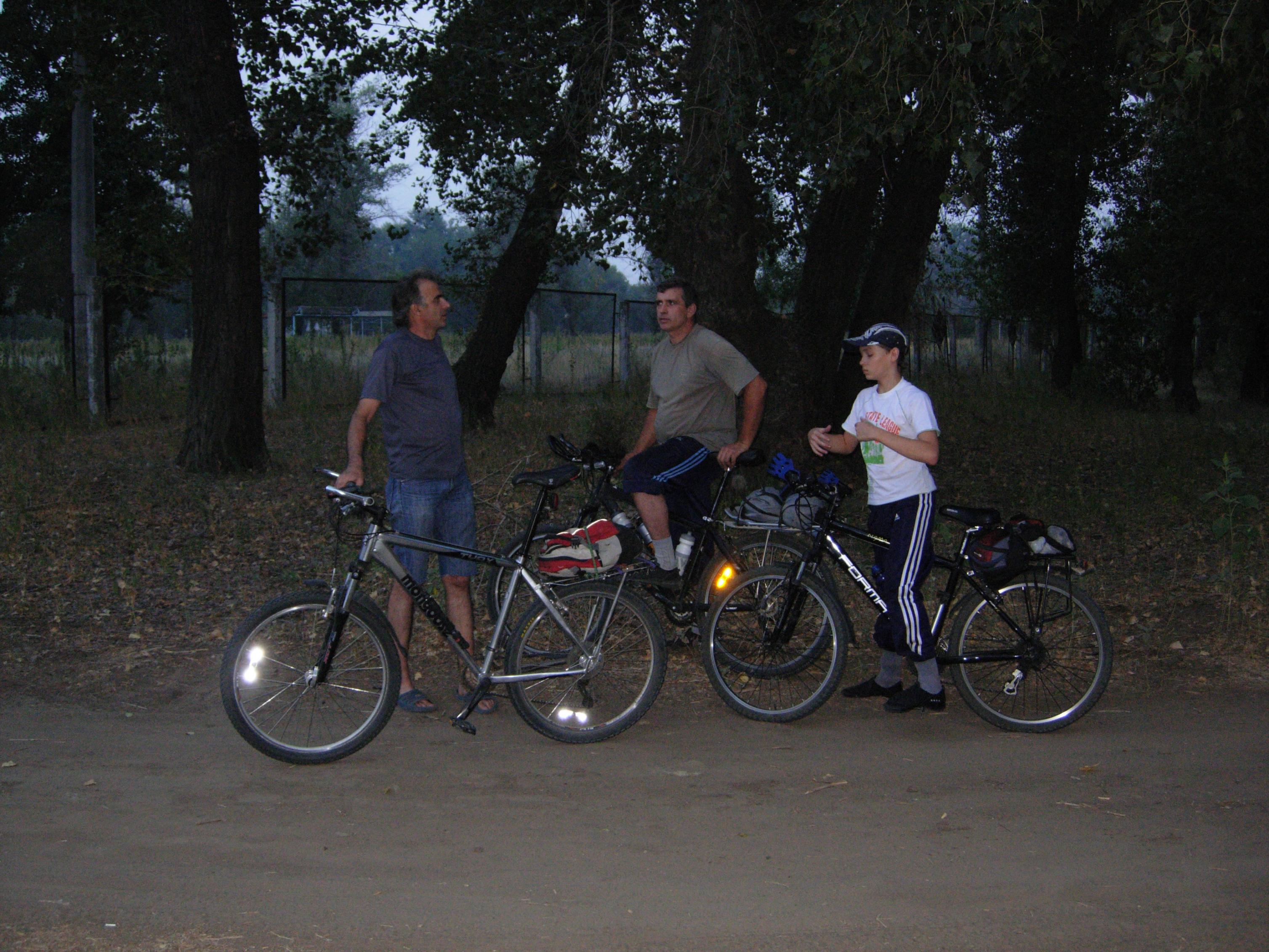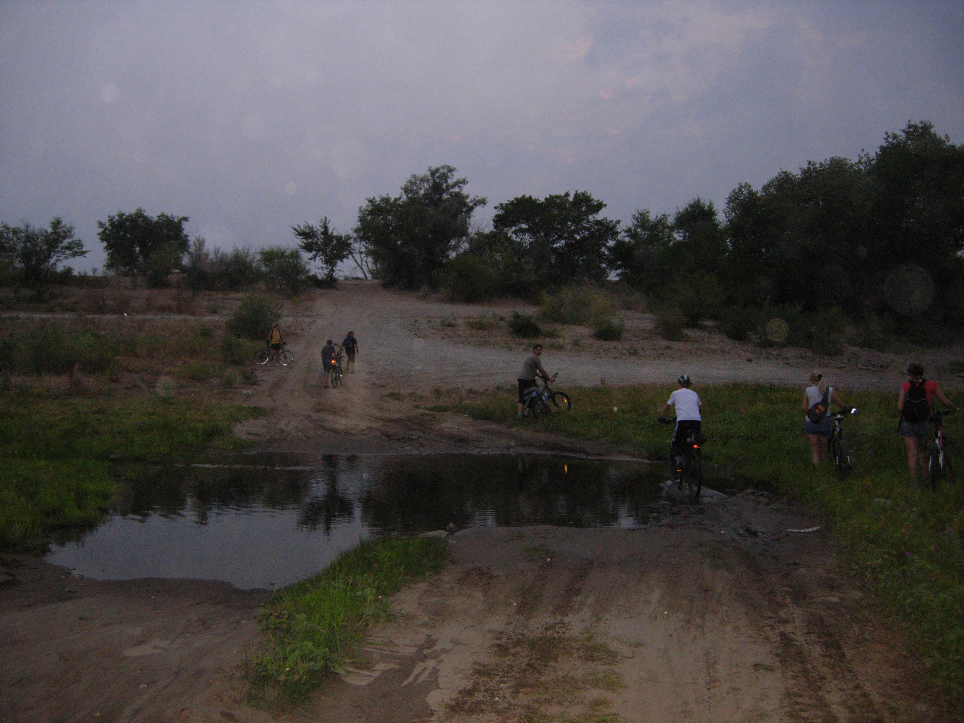 Вчера в 19:00 у Европы собралось просто небывалая толпа - 17, по-моему, человек. Образовалось 2 группы - одна поехала на тренировку в сторону Тумака, их было пятеро, вторая - 12 человек, - поехала на легкую прогулку. Как съездили спортсмены, не знаю - они планировали пробег 50-60 км. Отдыхающие переправились через Верблюд по нижней дамбе и поехали на Старенький. Доехав до Волги, посовещались - останавливаться на камнях или ехать до песчаного пляжа у т/б Волга. Решили ехать на пляж. Приехали уже в сумерках, поставили кипятиться чай, а сами полезли купаться. Когда чай заварился, уже ощутимо стемнело и налетели комары. Чай пришлось пить, приплясывая. Потом был ремонт колеса - один из нас поймал колючку. А когда ремонт закончился, комаров почему-то стало заметно меньше. Обратно ехали через Вишневую улицу, что в дачном массиве Верблюда. Дорога от Волги до дач Денежного озера тоже становится все более песчаной. Надеюсь, обещанные вскоре дожди это исправят. Потом было традиционное фото под фонарем предмостной эстакады и разъезд по домам - кто быстрей, кто медленней... Пробег по пойме составил 28 км. На дорогах довольно много песчаных участков, но непроезжих - почти нет.