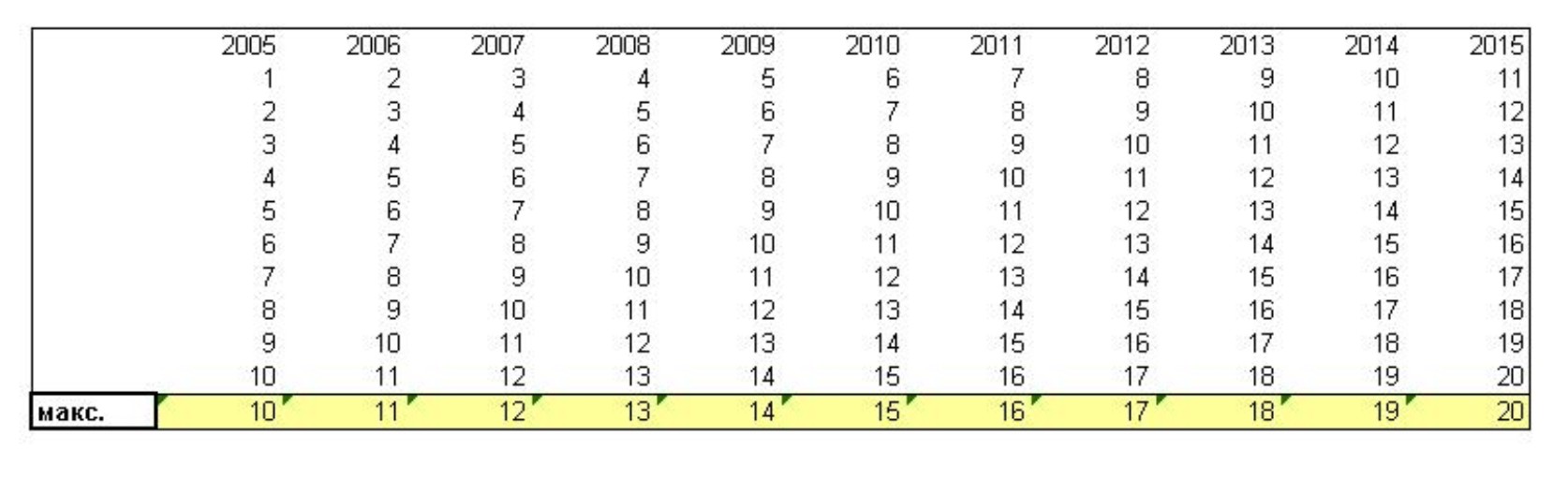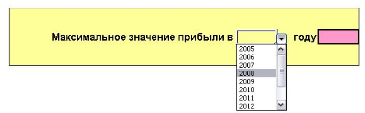 Есть данные в столбиках с заголовками годов: 2005, 2006, 2007 и т.д. (Рис.1), в которой уже получены максимальные значения (последняя строка). Есть ячейка (красного цвета), в которой должно отразиться значение максимальной прибыли в конкретном году, выбрав предварительно год из списка (Рис.2). Как сделать?