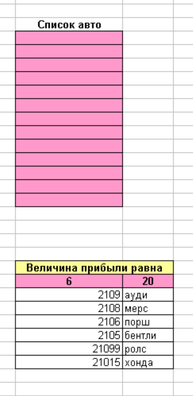 Теперь, если прибыль составила, например, 6, то в некоторой области (красным) должен появится список с отечественными марками авто, если прибыль равна 20, то список с иностранными авто. Списки авто создаются ранее в сторонке. Как? И еще: если я максимальное значение прибыли копирую в другой лист, где нет расчетных данных, то появляется сообщение "Н/Д", т.к. в первичном листе в выражении "= ГПР..." есть ссылки на данные. Как быть?
