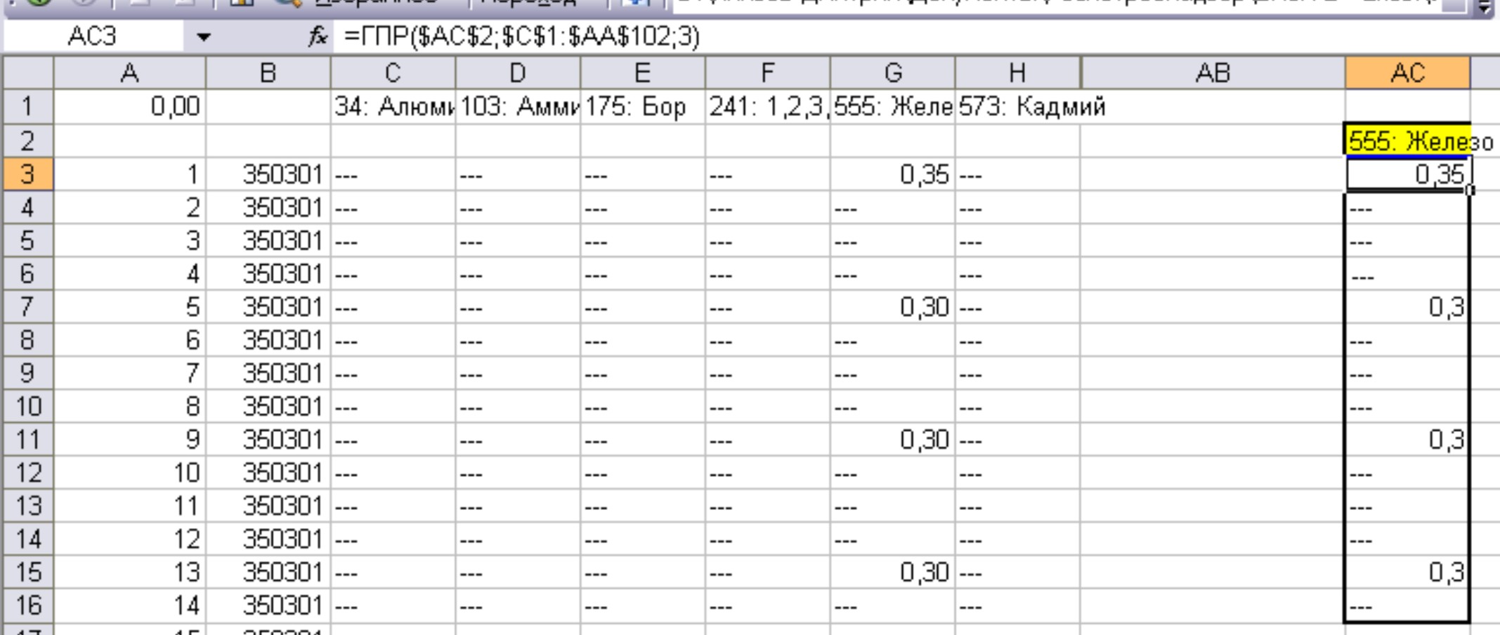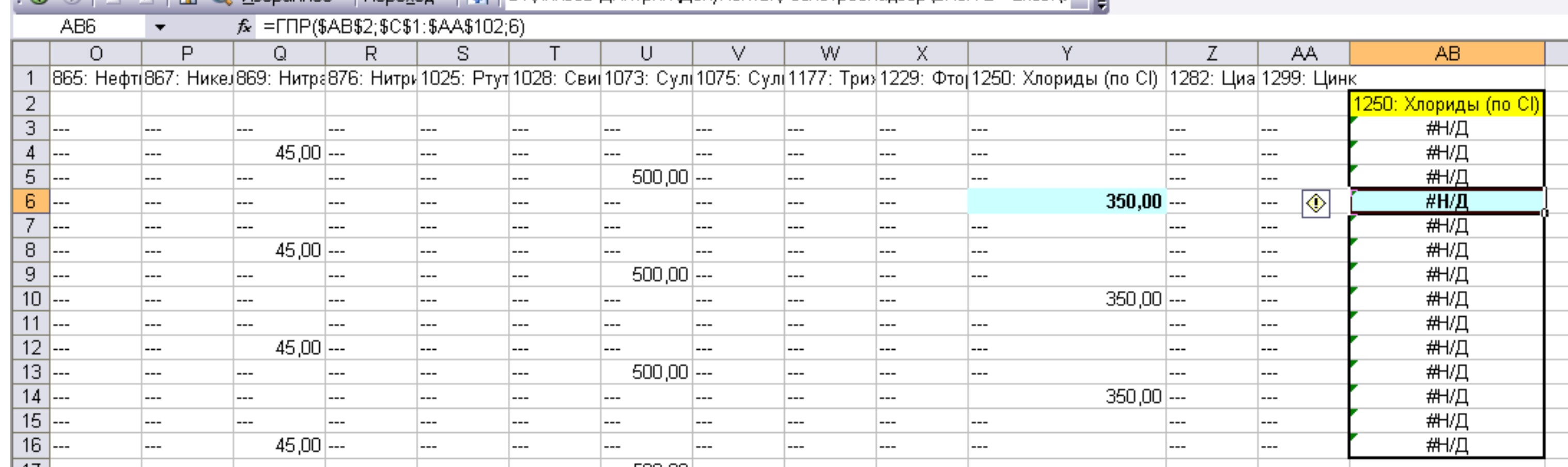 В "Y6" число "350", а в "АВ6" - "#Н/Д". Формула вроде как надо забита...????? Ищется значение в 6-й строке (350) для вещества 1250 (желтым)