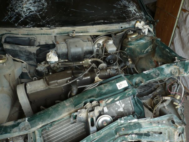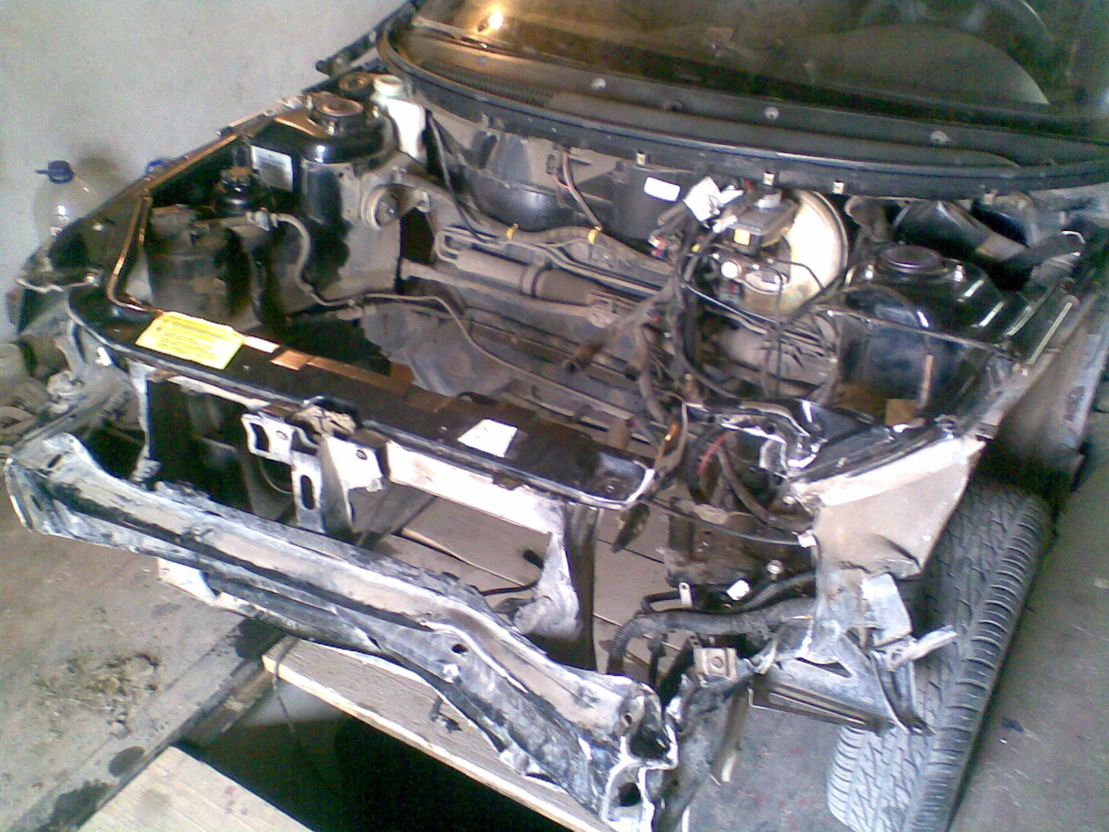 вот ударенная 2112, столкновение с УАЗом на 70 км/ч, обошлось заменой "телевизора" и навески.... двигатель снят для растяжки левого лонжерона. позже выложу фото 2109, столкнувшейся с Ford Focus, на такой же скорости....