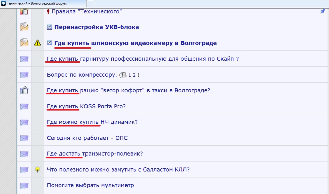 Вот, нашел ее: http://www.forum-volgograd.ru/showthread.php?t=173031 Тему "где купить супер-пупер-мега-гаджет" переделали в тему "куплю......." и перенесли умирать в раздел, который посещают только те, кто дает объявления о покупке. Все ответы в этой теме были даны, когда она была в техническом разделе Сколько появилось ответов, когда ее перенесли в раздел "Куплю"? - НОЛЬ. И всегда будет ноль ибо это раздел для барахольщиков ИМХО. Наивно думать, что всяк входящий на форум, кидается в раздел "Куплю" и начинает от нефига делать просматривать темы: "не ищет ли случаем кто СИНХРОФАЗАТРОН, который у меня случайно завалялся под кроватью...?" .... и так изо дня в день Всем давно уже понятно: хочешь продать, купить фотоаппарат: -напиши в фотораздел и получишь комментарии, как минимум. -напиши в раздел "Куплю" и комментариев будет НОЛЬ. Тоже самое с гаджетами технического раздела. Человек спрашивает: "Где купить, где найти...?" Обсолютно правильно полагая, что дома, в бабушкиных сундуках такие вещи не валяются. Так зачем тему переделывать в "куплю?" - я не понимаю.