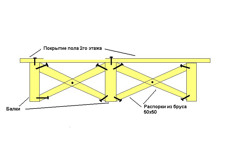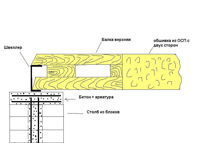 Думаю, минимум 20. Но говорю почти с потолка. Ссылок вам дали много - почитаете... я не читал их. Если у вас под швеллерами будут межкомнатные перегородки, то вообще можно обойтись без металла - сделать перегородки как в каркасных домах и на них опереть балки перекрытия. Если у вас бабла не меряно, то можете замутить и 8м балки, как предлагает ПЕ "законспирированый" А если денежки с неба не падают, то надо уходить от таких больших пролетов, которые могут вас разорить. И все ради чего? Чтобы потом все равно поделить 1 этаж на комнаты? Поэтому вариант со столбом самый экономичный. Необязательно его ставить точно по середине Сдается мне, что вы уже строите а планировку еще и не продумывали... Нафига вам на втором этаже ХОЛЛ? Там должны быть спальные помещения и комнаты с наименьшим посещением (гардеробные....) ..ну да ладно. Зачем вам перекрытия из бруса 100х200? Сколько он стОит? Думаю дофига! Сколько его нужно при пролетах 60-80 см? Вы готовы платить? При этом он провисает даже от собственного веса.... и это все для того, чтобы поставить диван и шкаф??? -Покупаете доску 4 метровую 50х100(120) -перекрываете пролет (как на рисунке), вставляя торцы досок в швеллер 20ку с шагом 60. -перекрываете еще раз точно так, только второй ярус досок ставите на верхнюю полку швеллера. У вас получится одна балка, а над ней через 10 см (за счет высоты швеллера) - вторая. -между нижней и верхней балкой вставляете обрезки тех же досок (в распор) и обшиваете все с двух боков ОСП. У вас получится балка толщиною 5см+2 слоя ОСП и высотой 30(35)см. Это будет легкая и очень прочная балка из доступных материалов. Намного жестче бруса на 200! Стоит ли обшивать балку ОСП по всей длинне - решите сами. У вас их будет много с шагом 60см (для закладки утеплителя). Сверху балки застилаете (закрепляете) листами ОСП. Чтобы балки не крутило от нагрузок, их необходимо "связать" друг с другом на середине длины: для этого к ним прибиваются распорки в виде крестов. Получится так: |X|X|X|X| Это вид с торца балок. Тогда снизу к балкам можно крепить рейки и обшивать гипсокартоном.... Как-то вот так Если я где не прав - меня подправят строители.