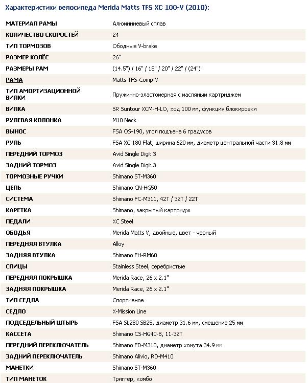 Merida Matts TFS XC 100-V (2010 год, колеса 26", 24-скор., размер рамы-20, отл. сост.), 15 тыс. Описание велосипеда Merida Matts TFS XC 100-V (2010): Хардтейл высокого любительского уровня, созданный для велосипедистов, предпочитающих совершать поездки по различным типам местности и увлекающихся кросс-кантри. Основу его конструкции составляет рама, изготовленная из алюминиевого сплава и имеющая геометрию, оптимизированную для спортивного катания. Собранный на этой раме велосипед укомплектован: пружинно-эластомерной амортизационной вилкой SR Suntour XCM-H-LO с ходом 100 мм и функцией блокировки, ободными тормозами Avid Single Digit 3 V-brake, легкими и прочными двойными ободами Merida Matts V, навесным оборудованием среднего уровня Shimano Alivio. 24 скорости.