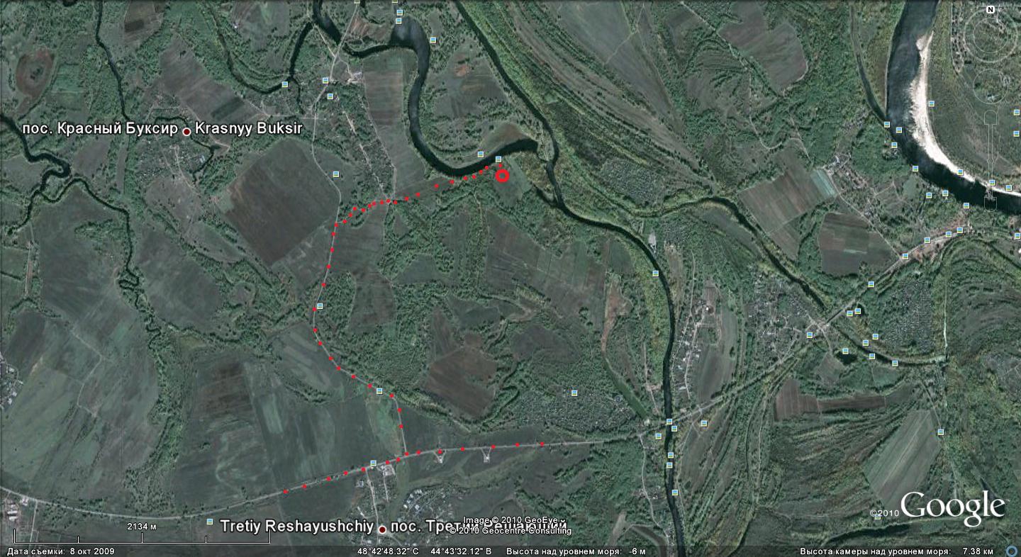 Я бы рад, но в этот форум файлы kmz не грузятся. Воообще-то это место легко найти. От поворота с трассы Красеослободск - Средняя Ахтуба в сторону Лебяжьей поляны до поворота направо на грунтовку - 2,33 км. Далее - 1, 7 км. по грунтовке до Поляны (рис. 2). Держаться дороги, ближайшей к ерику Гнилому. Промахнуться сложно.