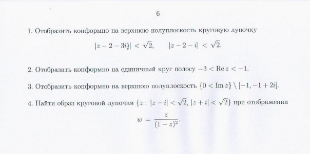 Да что ж там платно-то! Все просто с этими задачами, единственная трудность - нужно или помнить основные отображения, или в справочнике копаться - а это время:-), которое тратить на простенькие задачки не хочется (не интересно). Вот, например, 2я задача (бесплатно:-) ): 1. Берем отображение w_1=z+1. Это отображение отображает полосу -3<Re z< -1 на полосу -2< Re w_1 < 2 2. Берем отображение w_2= i*PI*w_1/4, где PI - число "ПИ" = 3.1415926... это отображение осуществляет поворото вашей полосы на 90 град (т.к. умножили на мнимую единицу 'i') и ее растяжение в 'PI/4' раз. Таким образом, это отображение отобразит вертикальную полосу -2<Re w_1< 2 на горизонтальную полосу -i*PI/2 < Im w_2 < i*PI/2. 3. Берем отображение w_3=e^{w_2}. это отображение отобразит полосу -i*PI/2 < Im w_2 < i*PI/2 на правую полуплоскость: Re w_3 >0 (по свойству экспоненты) 4. Берем отображение w_4=(w_3-1)/(w_3+1). это отображение переведет правую полуплоскость Re w_3>0 во внутренность единичного круга |w_4|<1 (по свойству дробно-линейного отображения: граница полуплоскости Re w_3>0, т.е. прямая x=0, перейдет в границу круга, т.е. в линию |z|=1, все, что правее прямой x=0 перейдет во внутренность круга, т.е. во множество |z|<1). ВСЕ! Т.о. ваше отображение есть комбинация данных 4х отображений, т.е. w_4=(w_3-1)/(w_3+1) = (e^{w_2}-1)/(e^{w_2}+1) = (e^{i*PI*w_1/4}-1)/(e^{i*PI*w_1/4}+1) = (e^{i*PI*(z+1)/4}-1)/(e^{i*PI*(z+1)/4}+1). Окончательно, ваше отображние W_4(z) = (e^{i*PI*(z+1)/4}-1)/(e^{i*PI*(z+1)/4}+1). P.S. Я же давал вам ссылку на хорошую книжку по ТФКП с разобранной кучей примеров и хорошим справочником по основным отображниеям... P.P.S. Давно задачки из ТФКП по отображениям не решал, лет 5, наверное. Вроде бы нигде ничего не напутал. Остальное решается тоже не сильно сложно - просто в справочнике копаться нужно... а мне лень как-то:-). Вот если бы интегралы от комплексных функций посчитать, иль вычеты, иль в ряд Лорана разложить - это можно и сразу.... P.P.P.S. Только передайте вашей девушке, что приведенное решение хорошо бы снабдить соответствующими рисунками, иллюстрирующими указанные 4 отображения , т.е. последовательно построить эскизы областей в плоскости 'Z', 'W_1', 'W_2', 'W_3', 'W_4'. Начертить то указанные области в данных плоскостях, надеюсь, для нее труда не составит? Иначе на ее решение очень косо смотреть будут и наверняка придумают, что спросить, на что она ответить не сможет...