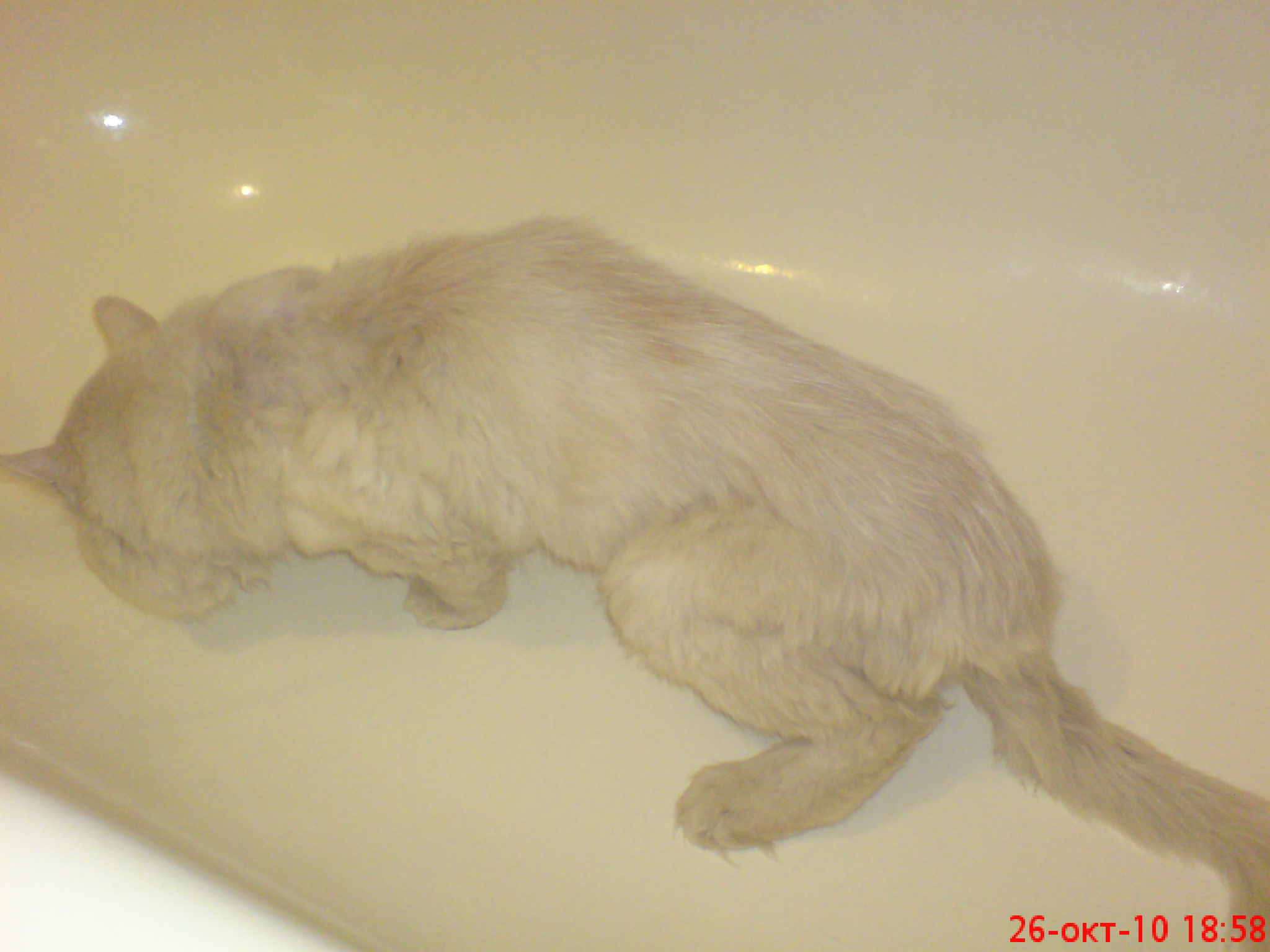 кот то ли (простите) обкакался, то ли его вырвало - не совсем поняла - просто жидкость какая-то на полу, приходится держать его в ванной, чтоб с моими тремя не контачил, они и так все в шоке
